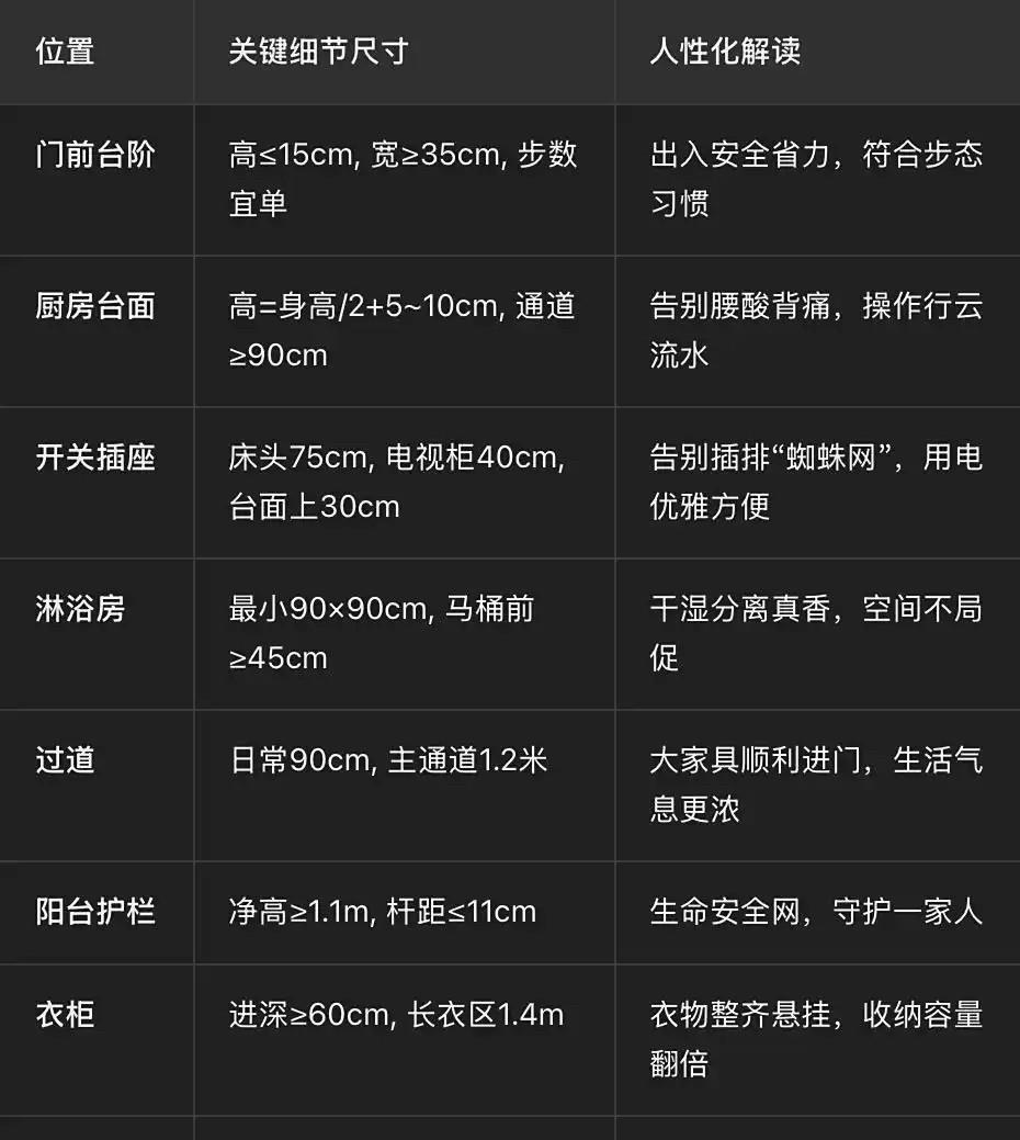 回农村建房,过来人的宝贵经验, 这8组关键数字,值得参考: 1、门口抬高一点,避免雨水倒灌, 大门门廊的台阶尺寸, 高度不大于15公分,宽度不小于35公分; 2、厨房是每天都要使用的地方, 要想告别腰酸背痛,台面的高度要合适, 具体来说,是主厨身高的一半, 再加上5-10公分,这样才能操作行云流水; 另外,厨房有岛台的话, 通道宽度不要小于90公分;[心][心] 3、开关插座,告别插排“蜘蛛网”, 床头和沙发高75公分,电视柜高40公分, 厨房台面高30公分,用电不用弯腰; 4、厕所使用频率最高,也是水多的地方, 想要做到干湿分离,关键在淋浴房, 最好做成独立房间,尺寸不小于90x90公分, 另外,马桶前的通道大于45公分; 这2个尺寸把握住了,空间不会局促; 5、房子过道尺寸,最容易被忽略, 其实特别重要,尤其是搬运家具的时候, 建议过道尺寸不小于90公分, 另外,主通道最好是1.2米;[心][心] 6、阳台家家户户都有, 但护栏高度很关键, 一旦搞错,就会留下安全隐患; 护栏净高必须不小于1.1m, 竖向杆距不大于11公分;[发怒][发怒] 7、卧室必须要有衣柜, 衣柜的尺寸,会影响卧室的大小, 建议衣柜进深不小于60cm, 长衣区的高度大于1.4m, 这样的衣柜,衣物整齐悬挂, 收纳容量可以翻倍;[得意][得意] 8、基础不牢,地动山摇, 地基一定要坐在老土层上方, 最小埋深不低于50公分; 对于#农村自建房# 大家还有什么数据经验, 欢迎在评论区补充[作揖][作揖] #晒图笔记大赛# #万能生活指南#
