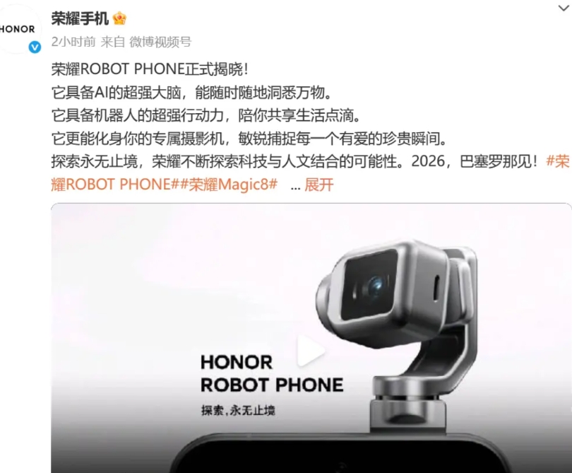 荣耀Pocket3来了?荣耀ROBOT PHONE正式亮相,看起来很像大疆的云台Vlog相机,但荣耀加入了AI功能,让手机“动”了起来,似乎有了生命。 它能实现的功能肯定不止是拍照拍视频,看视频还可以理解用户的意图,做出一些人性化的反馈。 而且设计也很特别,云台可以收缩放在后置相机模组里面。 荣耀表现这款产品将于2026年亮相,最终产品是不是长这样还不好说,但未来发展一定是AI,手机越来越聪明。