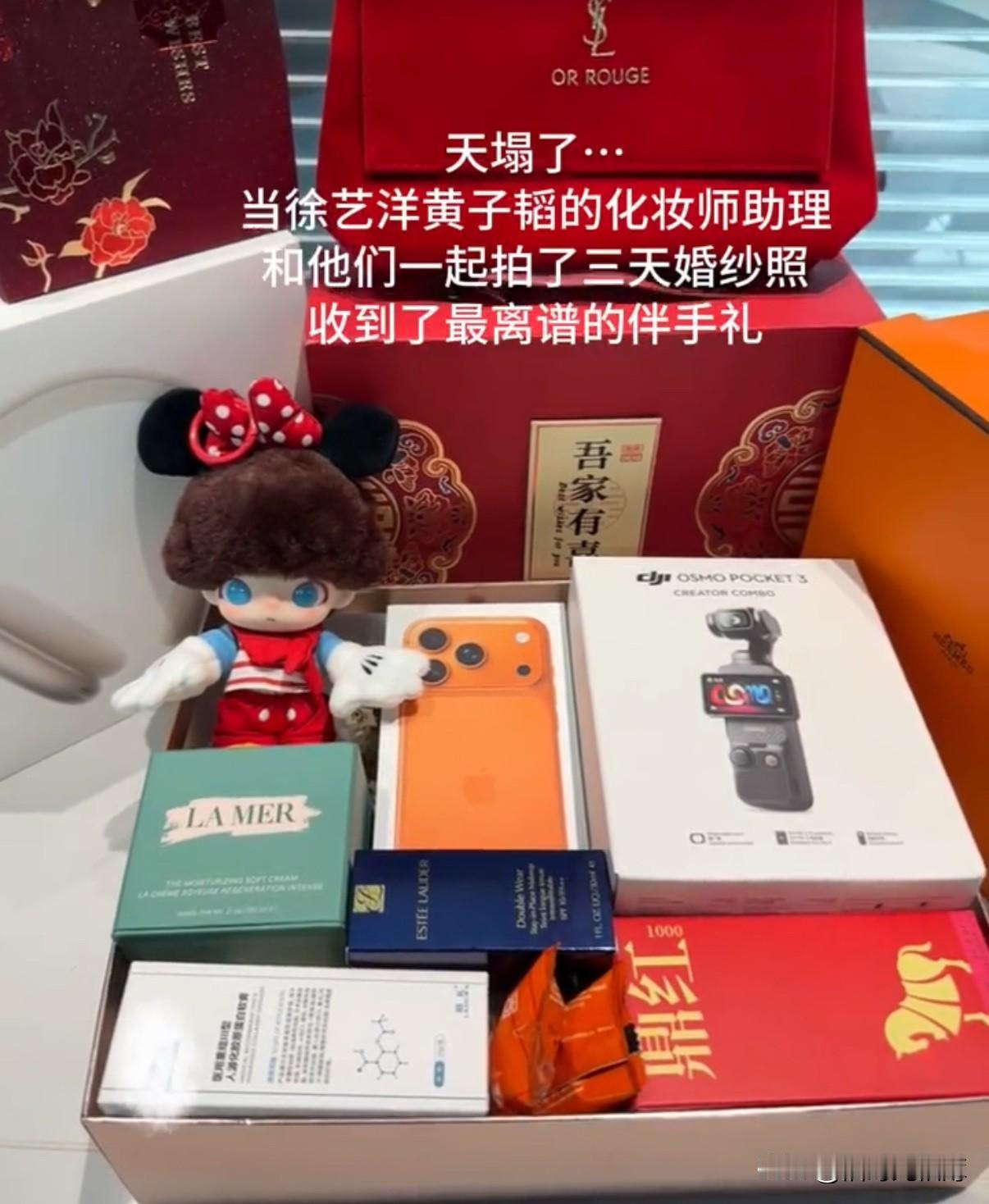 黄子韬徐艺洋真大方,有东西他俩是真给啊~~徐艺洋黄子韬的化妆师助理和他们一起拍了三天的婚纱照,然后就收到了特别壕气的伴手礼,爱马仕礼盒、iPhone17、圣罗兰、海蓝之谜、雅诗兰黛、大疆口袋云台相机,真是大写的羡慕了[大笑][大笑]