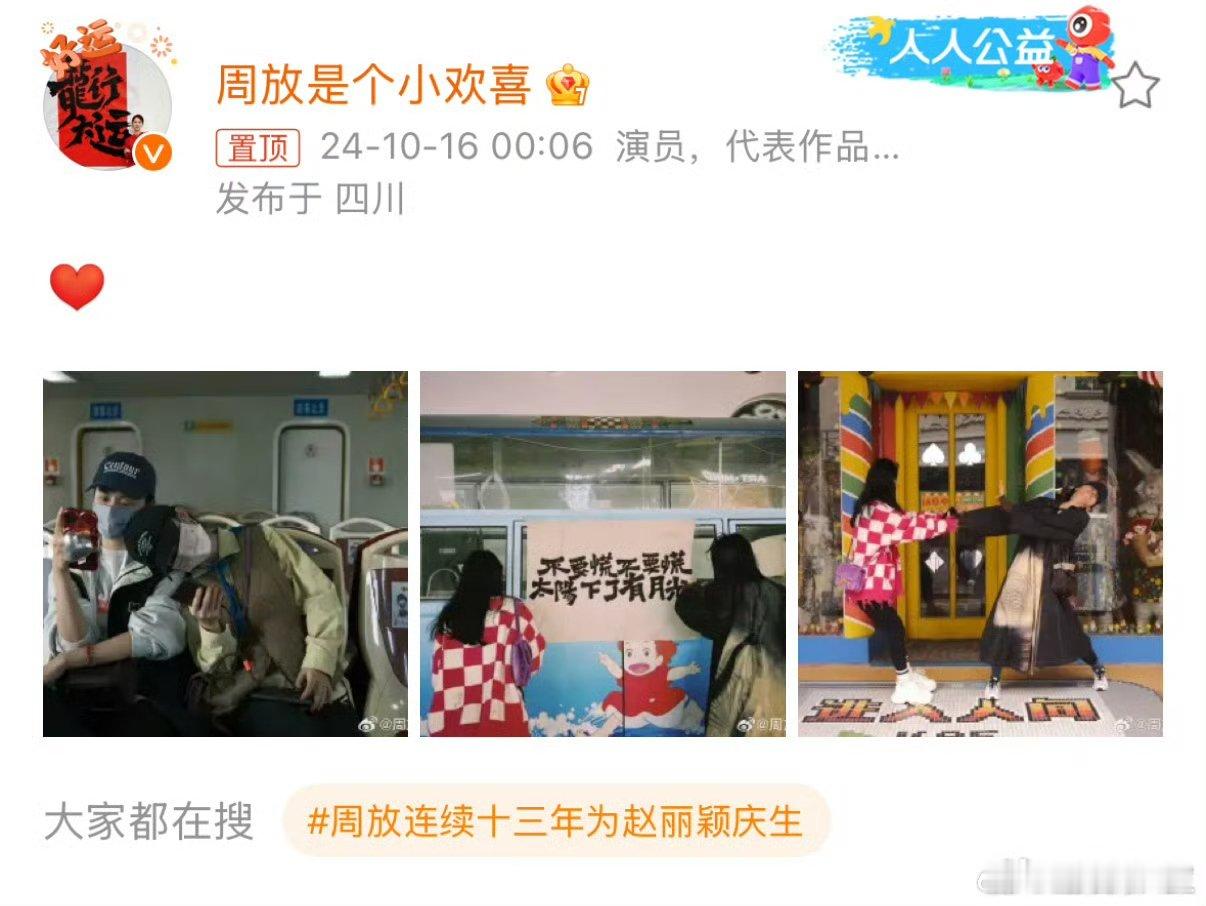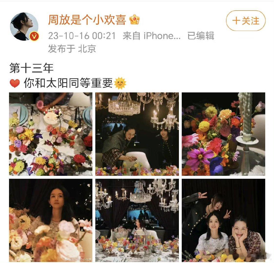 周放连续14年为赵丽颖庆生周放发文为赵丽颖庆生,“她今天过生日!!好好爱她!!