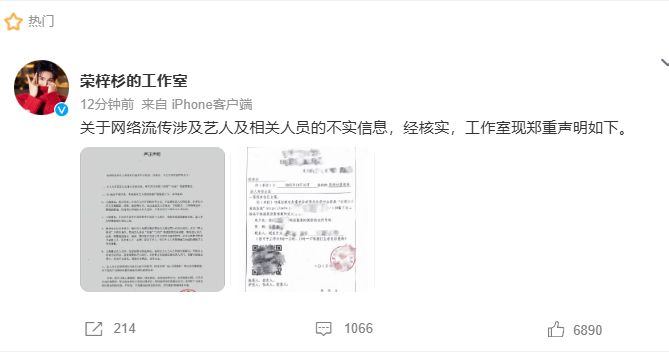 荣梓杉工作室称恋爱出轨是不实信息,针对外界关于荣梓杉、李禹熹的传闻发布声明否认,