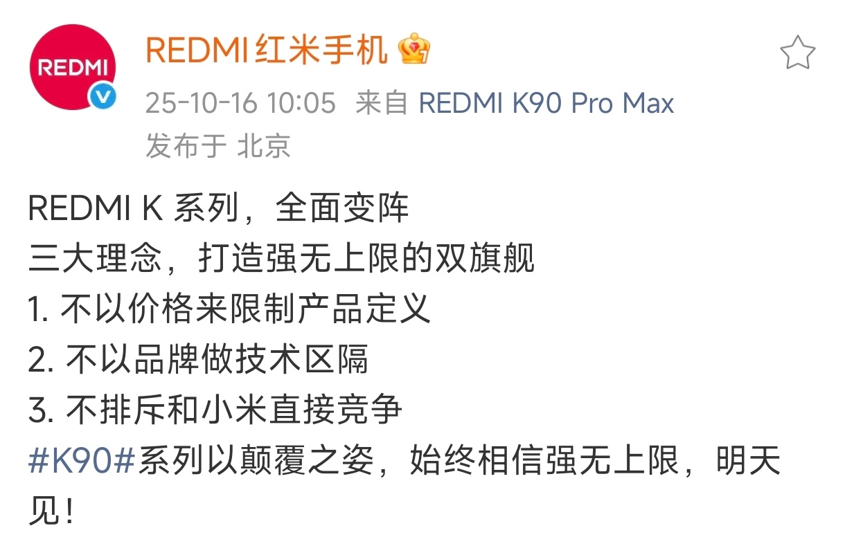 因此再回头看Redmi K20 Pro的成功,虽然将死了自家大哥小米9,但它也成功保住了小米在当时2K-3K价位的份额,进而给了小米10往4K+突破的勇气。从前几年开始,小米在高端有所成就之后,内部氛围自然好了很多,如今小米17系列已经完成了5K-7K价位的突破,那留下的3-5K价位自然就需要一个强力的产品去继承,小米17标准版定位小屏+体验,那此时就需要一个大屏+堆料的“传统意义”上的超级大水桶来与小米17形成互补,这便是今年REDMI K90 Pro Max的产品逻辑。