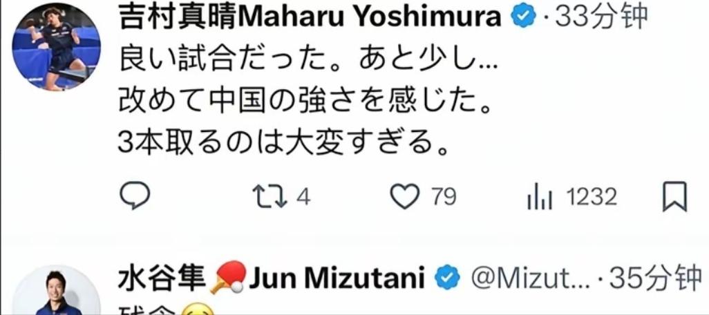 被国乒大逆转后,日本前名将水谷隼发文了! 国乒男团让二追三,打出史诗逆转之战,日本男团则痛失好局,领先再多也没能赢下比赛,还是那句话,别给机会,不然你会很难受。 赛后,不少日本选手都发文感叹,前名将水谷隼也用“残念”2字总结,可见其难受之情再次涌现,以前在时打不过,现在退役了还是打不过。 亚乒联必罚张本智和,赢了中国梁靖崑,他冲着中国教练团队在骂人,指手画脚,这样的运动员有资格参加比赛吗,必须严惩! 张本为什么这么恨自己祖国的球队?如此张狂的发泄,他这种的反骨表现,正常人是很少有的,比纯正的日本人胜中国人都兴奋,一定和父母的教育有关。中国人、中国队应该重新审视这一家人,防范这家人,记住“农夫与蛇”的典故,否则一不小心,会被这窝毒蛇咬伤。 比赛,有输就有赢,输赢是很正常的事情。张本为什么总是那么的激动?也真应该为中国男乒队员点赞!陷入逆境不气馁,咬牙站稳气如虹,挥拍力战四小时,为国争光美名扬。