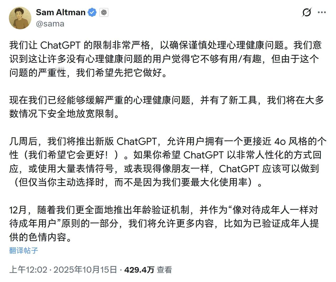 AI要被用来搞黄色,奥特曼终于不装了,ChatGPT将提供成人颜色内容。OpenAI老板奥特曼正式宣布,今年12月将推出一个支持成人主题对话内容的ChatGPT版本,包括颜色内容,仅限于通过验证的成人使用。果不其然,不少人担心的事还是发生了。 自从去年OpenAI火出天际,全球AI产业一夜迈入新时代后,没有任何技术认知的普通人,也能轻松做出各种以假乱真的图片或视频,更不用说什么明星换脸、一键脱衣全都能轻松搞定。所以这两年行业内一直面临一大难题,就是如何规范AI工具的使用,对那些打着AI名义搞黄色捞偏门的歹人,也缺乏足够的震慑惩治。 国内因为情况特殊,AI颜色内容尚且可控,国外不管是OpenAI还是马首付的xAI都早已沦为成人颜色的修罗场,以前搞黄网和色APP的人,想方设法把战场迁移到了这些大火的AI平台上。有了AI的助力,这批人继续大发横财,却把激增的AI服务器成本压力扔给了平台。 终于大佬奥特曼不干了,既然清不掉还打不过,那就干脆直接加入好了,有钱一块赚。尤其是成瘾性最广泛的全球颜色产业,每日的资金流水难以想象,一向以利润为导向的OpenAI,自然更不想放过。就算奥特曼表示会设置验证程序,不过只是给自己挣钱找块遮羞布罢了,这种东西要是能挡得住那些小色胚,黄产怕是早喝西北风了。