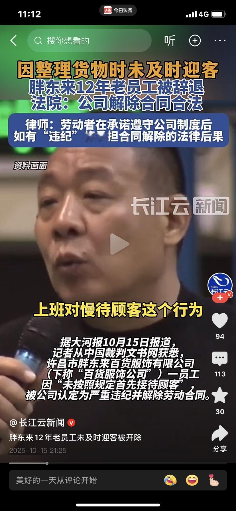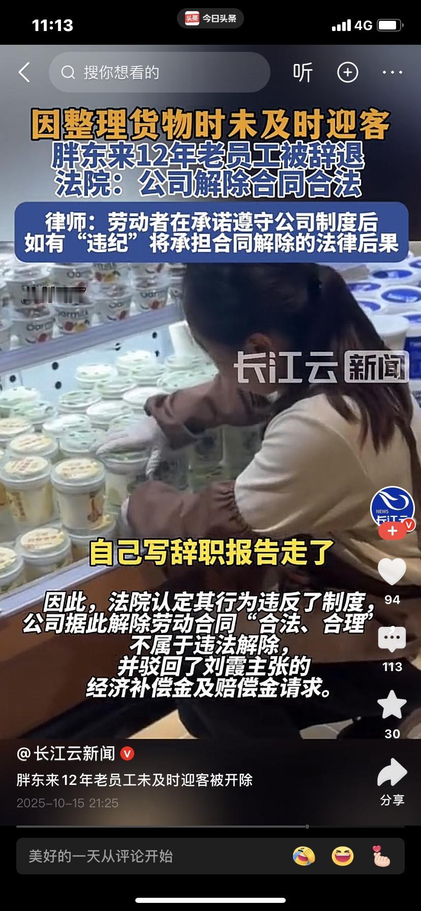 胖东来开除入职12的员工背后 近日胖东来因一员工未及时接待顾客违反公司有关规定,被开除。可想而知胖东来对每位顾客的重视程度。而一位员工能在公司呆十二年,说明这公司有她值得奋斗的动力。 按正常来说,公司开除员工,要么是工作偷懒,犯大错之类的,但是该员工只是在整理货品,忽视了公司以人为本的原则,并没犯多大的错,但是纪律就是纪律,无规矩不成方圆这就是胖东来超市能成为“5A景区”的原因。 对于一个在公司工作12年的老员工来说,公公的规章制度肯定了然于胸,能犯下这么低级错误确实不应该,公司福利好,对员工的每个细节严格,为公司更好发展,我想这处罚结果也不为过。你们觉得呢胖东来超市 胖东来管理模式
