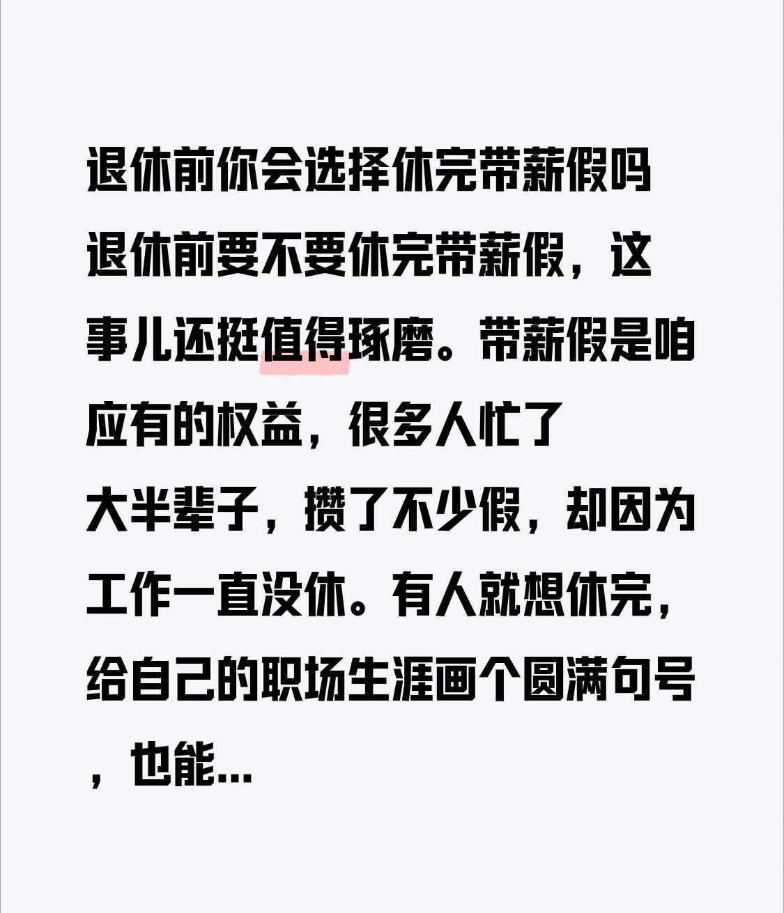 退休前你会选择休完带薪假吗退休前要不要休完带薪假,这事儿还挺值得琢磨。带薪假是
