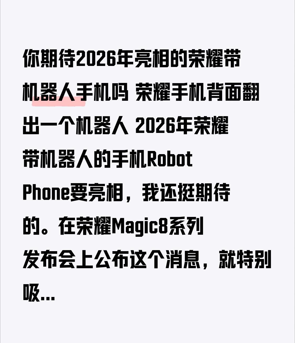 你期待2026年亮相的荣耀带机器人手机吗 荣耀手机背面翻出一个机器人 2026年荣耀带机器人的手机Robot Phone要亮相,我还挺期待的。在荣耀Magic8系列发布会上公布这个消息,就特别吸引人。 荣耀Magic8系列本身在AI方面就很牛,有8大技术领先和8大AI体验领先,像一键领券购物、一键美食服务这些功能超实用。而Robot Phone更厉害,有环境认知决策、物理交互执行和智能影像记录功能,从概念视频看还有可升降云台相机。 荣耀CEO说终端要从工具变伙伴,这机器人手机要是成了,那手机可就不只是通讯工具了,感觉生活都会方便很多,真希望早点见到它的庐山真面目。