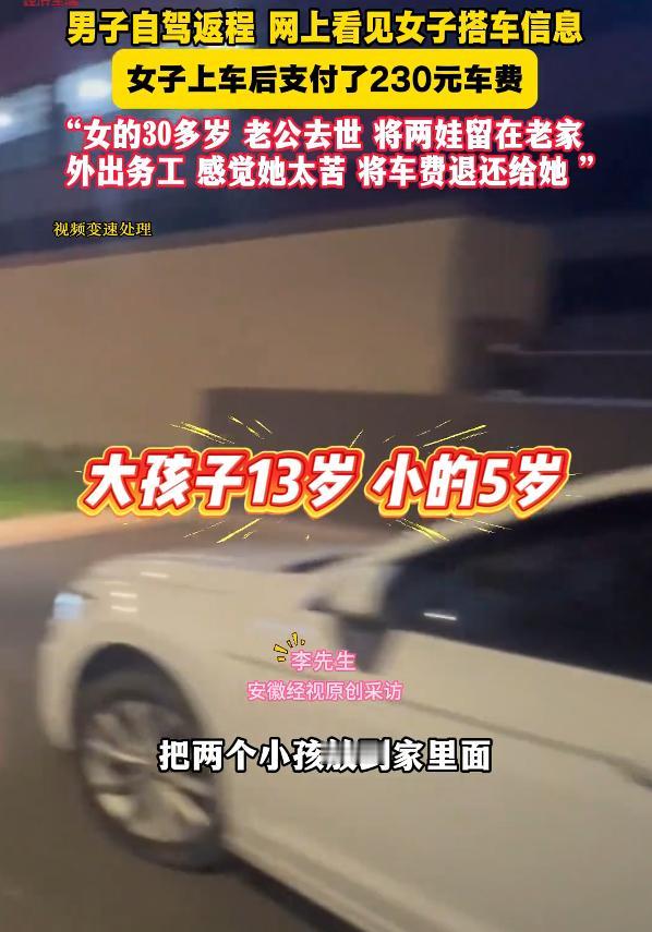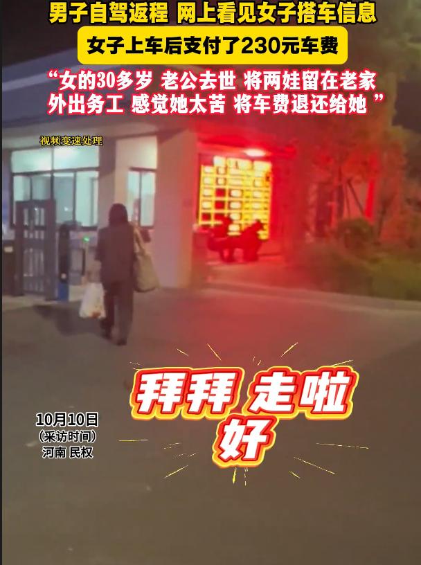 太感人!10月10日河南民权男子自驾回宁波,网上找了一个30多女乘客,车费230元,不料,男子竟然悄悄把车费原路退回,原来女子的丈夫去世,家里还养2个孩子,女子不得不外出打工赚钱,他觉得女人太苦了,不容易! 现在出门在外,能顺道帮个忙搭个人,也是件积德事。 河南一位男子自驾返程回宁波慈溪,看到有人搭车。想着顺路还能赚点油费,也能让女子少些奔波,男子就答应让女子上了车。 按照路程算下来,女子应该付 230 元车费,女子也没犹豫,把钱给了男子。本以为这就是一次再普通不过的顺路搭乘,可谁能想到,中途发生的事,让这趟行程变得不一样了。 在乘车的过程中,两人难免会聊上几句,也就是在聊天的时候,男子才知道了女子的处境。原来女子的丈夫已经去世了,家里还有两个孩子,为了能让孩子过上好一点的生活,女子只能一个人外出打工赚钱。 家里的孩子没人照顾,只能留在老家让老人帮忙看着,女子自己则背井离乡,独自承受着生活的压力,就为了多挣点钱,给孩子攒学费、生活费。 男子听完女子的经历后,心里很不是滋味。 他想着,一个女人家,没了丈夫的依靠,还要独自撑起一个家,带着两个孩子,外出打工本就不容易,一路上肯定吃了不少苦。 再想想这 230 元车费,对于自己来说可能不算什么,但对于女子而言,说不定是孩子好几天的生活费,或是家里的一些急用开销。 想到这些,男子没多犹豫,当下就决定把 230 元车费退还给女子。女子一开始还挺意外,推辞着不肯要,可男子态度很坚决,他说:“你一个人带着孩子打工太苦了,这点钱你留着给孩子买点东西,我也没多帮上什么忙,这点心意你收下。” 有网友说:“这位男子也太善良了,虽然 230 元不多,但这份心意重千斤啊,在别人困难的时候能伸一把手,这样的人值得我们点赞。” 还有网友留言:“女子的遭遇太让人同情了,一个人扛起一个家不容易,希望她以后的生活能越来越好,也希望能有更多人能像这位男子一样,在别人需要帮助的时候搭把手。” 也有网友表示:“能有这样心怀善意的人,真的很温暖,这才是我们该弘扬的正能量啊。” 生活中像这样的小事还有很多,但正是这些看似不起眼的小事,却能让我们感受到人与人之间的温暖。 这位男子没有因为自己只是顺路捎人,就对女子的困境视而不见,反而主动退还车费,这份善意虽然简单,却实实在在地帮到了女子,也让更多人看到了普通人身上的闪光点。 而女子在困境中没有放弃,依然努力打工赚钱养家,这份坚韧也值得我们敬佩。 网友们的评论之所以这么多,也是因为大家从这件事儿里看到了善良和坚强,这些都是我们生活中特别珍贵的东西。 咱们常说,人心齐,泰山移,可人心的齐,不就是从这些一件件小事里积累起来的吗?当有人遇到困难时,有人愿意伸出援手;当有人努力生活时,有人愿意给予鼓励,这样我们的生活才会更有温度,我们身边的正能量才会越来越多。 可能有人会说,230 元钱也不是什么大数目,可对于需要的人来说,这 230 元可能就是解燃眉之急的钱。这位男子的做法,不是说他多有钱,而是他懂得换位思考,能体会到别人的难处,这份同理心比什么都重要。 现在很多人在生活中难免会遇到压力,有时候一句温暖的话,一个小小的帮助,就能让人重新鼓起勇气面对生活,就像这位女子,收到退还的车费后,心里肯定也会多一份温暖,这份温暖或许能让她在打工的路上更有动力。 毕竟生活不易,谁都有可能遇到难处,要是咱们每个人都能像这位河南民权的男子一样,在别人需要的时候多一份善意,多一份理解,那咱们的生活环境肯定会越来越好,人与人之间的关系也会越来越亲近。 信息来源: AHTV第一时间 2025-10-10 男子自驾返程,网上看见女子搭车信息,女子上车后支付了230元车费