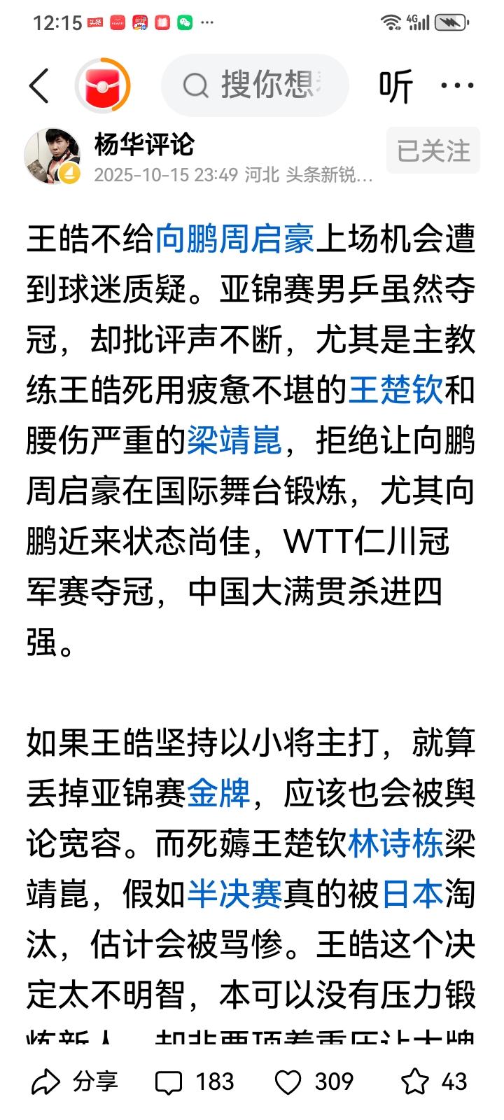 不要鸡蛋里挑骨头,亚锦赛团体赛国乒男女队都获得冠军,皆大欢喜,有人开始无事找事,故意带节奏喷王皓指导,说他胆量小不敢给向鹏,周启豪上场的机会,说真输给香港队也没什么,若真输给香港队就是铺天盖地的骂了,教练队员都负不起这个责任。 教练组什么时候也比外行强,队员们都是循序渐进的过程,向鹏这次能进入主力,随团队感受大赛的紧张压力,也是向前进了一大步,虽然没上场一直在陪练队友,场下加油鼓励队友,心也在场上队友的身上,获得冠军后和队友一起登上领奖台,是多大的幸运和收获。相信向鹏是感恩知足的,他也会更加的努力。