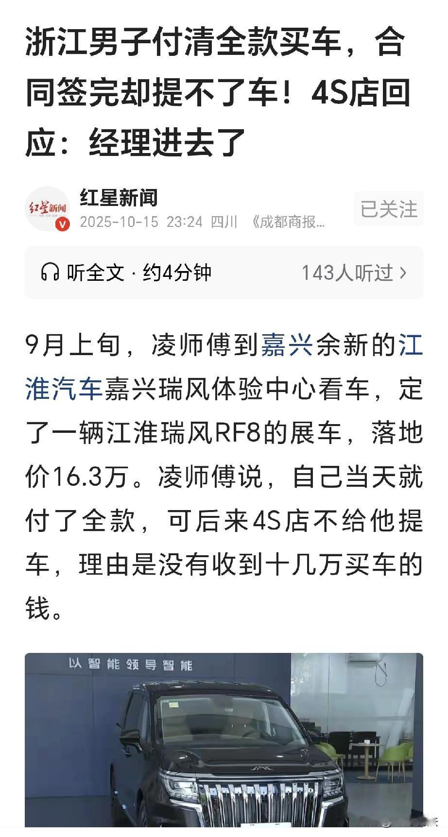 浙江嘉兴,一男子花16.3万,订了辆江淮瑞风RF8的展车,合同签完,男子支付了全款,男子想提车时,经理要他等待配件,说厂家在搞活动,可以把这辆车座椅置换掉,男子又等了几天,发现经理失联,男子急忙到4s店提车,可店里不给,说没收到十几万车钱,男子拿出合同,大吃一惊,他这才发现,合同上没有公章,只有经理个人签名,4s店: 经理被抓进去了!男子崩溃: 我的钱到哪了? 凌师傅为了出行方便,早就有了买车的想法,9月初的时候,凌师傅备好了现金,到嘉兴某体验中心看车。 凌师傅打算,只要看好,他就当场拿下,他还要全款买车,绝不想背车贷生活。 到了4s店里,店里有一辆江淮瑞风RF8展车,这辆车的外形,正是凌师傅喜欢的类型。 凌师傅看了配置,也是非常的满意,他围着车多看了几眼,这时过来了一位销售仇经理。 仇经理告诉他说,现在厂家在搞活动,如果你买这辆车的话,厂家可以将航空座椅置换掉,出厂的话是没有的。 凌师傅一想,虽然是展车,能置换掉航空座椅也不错,于是俩人开始商量价格,最终以落地价16.3万成交。 凌师傅高高兴兴签下了合同,然后签字,凌师傅不愿贷款,当天就给店里支付了全款。 凌师傅收好了合同,并没有当场提车,因为要更换座椅,他满怀希望回到了家里。 眼看快到十一长假,凌师傅就想尽快提车,他心里想着,马上就要过节,就能开着新车出去看景。 谁知等了几天,还不见动静,凌师傅联系那位仇经理,仇经理告诉他说,厂家的航空座椅还没到那。 凌师傅有些着急,可仇经理又是一番劝说,要他不要着急,最好等厂家把配件发来,一切弄好后再提车上牌。 凌师傅虽然着急,但是想想这话也有道理,不然以后还得折腾,不如一次弄好后再去提车。 凌师傅耐心等待,可过了几天,他又开始着急,他打过去电话再联系仇经理,谁知他发现,仇经理失联了。 凌师傅顿时吓得不轻,赶忙就往店里跑去,他一打听,听说仇经理被抓进去了。 凌师傅脸都白了,急急火火来到店里要求提车,这回他是非提不可,可4s店工作人员却给他说,他不能提车,因为4s店里没收到车钱。 凌先生懵圈,自己明明已经交付了全款,我有合同,你们不能不让我提车! 谁知他拿出合同,仔细一看,合同上没有图章,只有仇经理个人的签名。 凌师傅又仔细回忆,他付款的时候,当时扫 码支付时,跳出来的账户上显示是嘉兴江淮汽车。 凌师傅没有多想,以为这就是公司的账户,他立刻输入密码,支付了全款。 可是他万万没有想到,这个账户只是仇经理个人的账户,他只是把自己的名称设置成了嘉兴江淮汽车。 凌师傅看到是这样的名字,误以为这是公司的账户,毫不犹豫的付款给他,而4S店的财务总监,却只是收到他的10000元定金而已。 但是,凌师傅不愿意了,我是在你店里买车,是在你们店里的经营场所里交易的汽车,这个责任应该你们来负,而不该由消费者来承担责任。 因为沟通未果,到了9月30号下午,凌师傅又到4S店,销售王先生过来接待了凌师傅。 那么这位仇经理到底和4s店是什么样的关系,王先生做了答复。 原来,仇先生和4s店老板已经谈好,他承包了店里的卖车业务,车辆归属权属于店里,由仇先生卖车。 至于仇先生卖多少钱,卖多卖少,店里不管,只要他把店里要求的钱打给4s店里,店里就可以把车给凌师傅了。 可是谁也没有想到,仇经理出了意外,至于他到底出了什么事情,销售员也不知道。 如今只有等仇先生出来了,把钱支付给4s店,凌师傅才能把车提走,可凌师傅不愿意了,那要是他出来了,钱被花完,那又该如何是好? 《民法典》第172条规定: 行为人没有代理权、超越代理权或者代理权终止后,仍然实施代理行为,相对人有理由相信行为人有代理权的,代理行为有效。 虽然合同上没有公章只有仇经理个人签名,但凌师傅基于仇经理的职位和4S店的经营环境,有理由相信仇经理有代理权,符合表见代理的构成要件,因此4S店应当承担相应的合同义务。 《民法典》第490条规定: 当事人采用合同书形式订立合同的,自当事人均签名、盖章或者按指印时合同成立。在签名、盖章或者按指印之前,当事人一方已经履行主要义务,对方接受时,该合同成立。 凌师傅已履行主要义务,4S店也接受了该行为,因此合同是成立且有效的。 《民法典》第五百七十七条规定,当事人一方不履行合同义务或者履行合同义务不符合约定的,应当承担继续履行、采取补救措施或者赔偿损失等违约责任。 凌师傅作为消费者,在4S店购买车辆并支付了全款,4S店有义务按照合同约定向凌师傅交付车辆。 4S店以未收到车款为由拒绝交付车辆,构成违约,应当承担继续履行交付车辆的义务或者赔偿凌师傅的损失。 10月13号,凌师傅见到仇经理,但果然仇经理没钱给店里支付车款。 但凌师傅已经支付了车款,他坚持要提车,目前双方还在进行交涉。 关注@王哥说法 多学法律少吃亏!