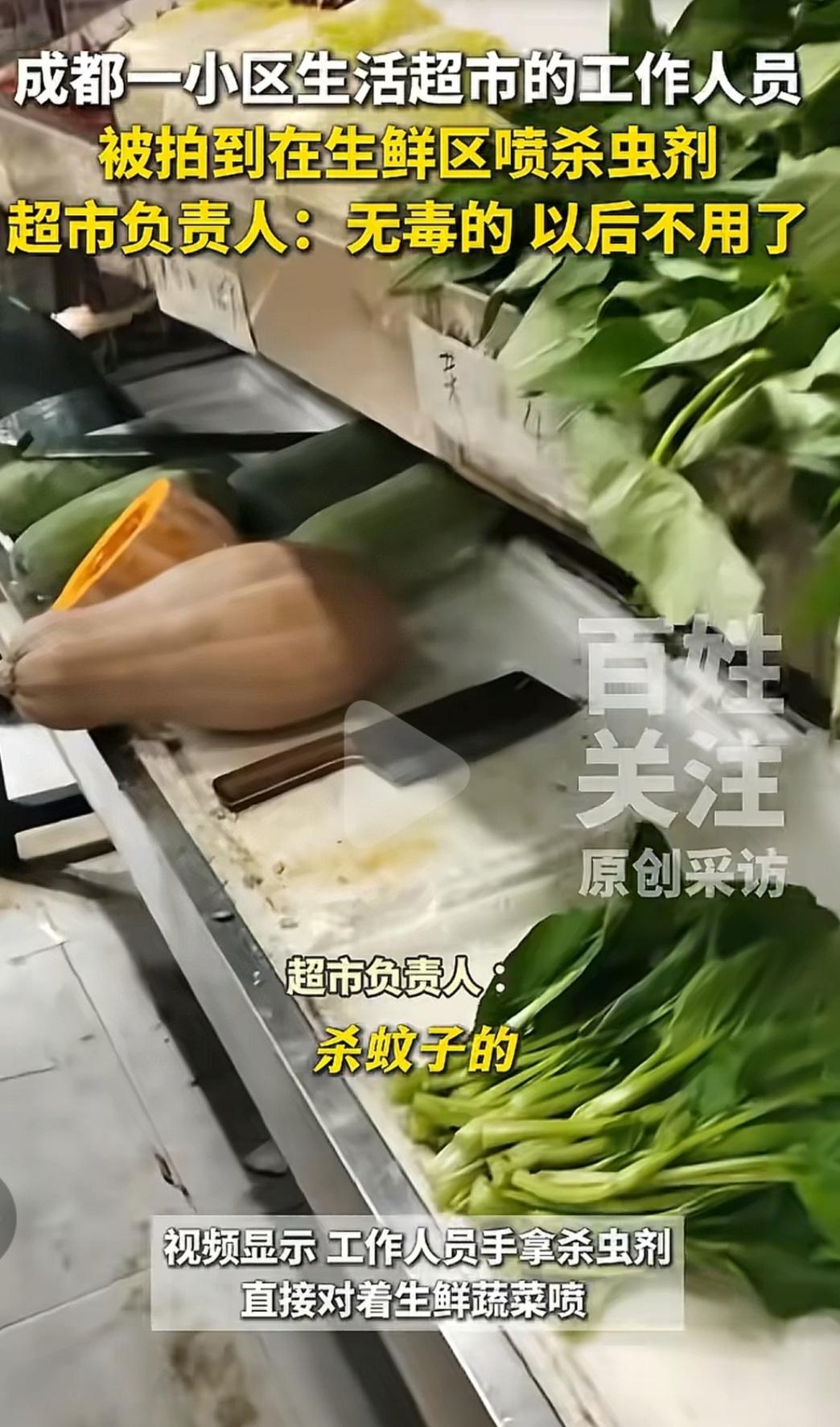 2025年好小众的词汇:超市用无毒的杀虫剂噴菜,你敢吃吗? 近日,成都一则视频炸了锅,某小区生活超市的工作人员,竟手持杀虫剂直接对着生鲜区的蔬菜喷洒,周围还有顾客在挑选商品。 面对质疑,超市负责人辩解称,用的是“无毒的杀虫剂”,只是为了“杀蚊子”,还表示被喷蔬菜已下架废弃,“以后不用了”。 但这说法根本站不住脚——根据食品安全标准,杀虫剂绝对不能直接接触食品,即便标注“微毒”,也含危害健康的化学成分,且残留难以彻底清洗干净。 专家明确指出,长期食用这类有残留的食品,可能损害神经系统、消化系统。 目前涉事店铺已被市场监管部门查封,调查正在进行中。所谓“无毒喷菜”,不过是罔顾食品安全的借口,这样的蔬菜,谁敢吃? 成都 超市