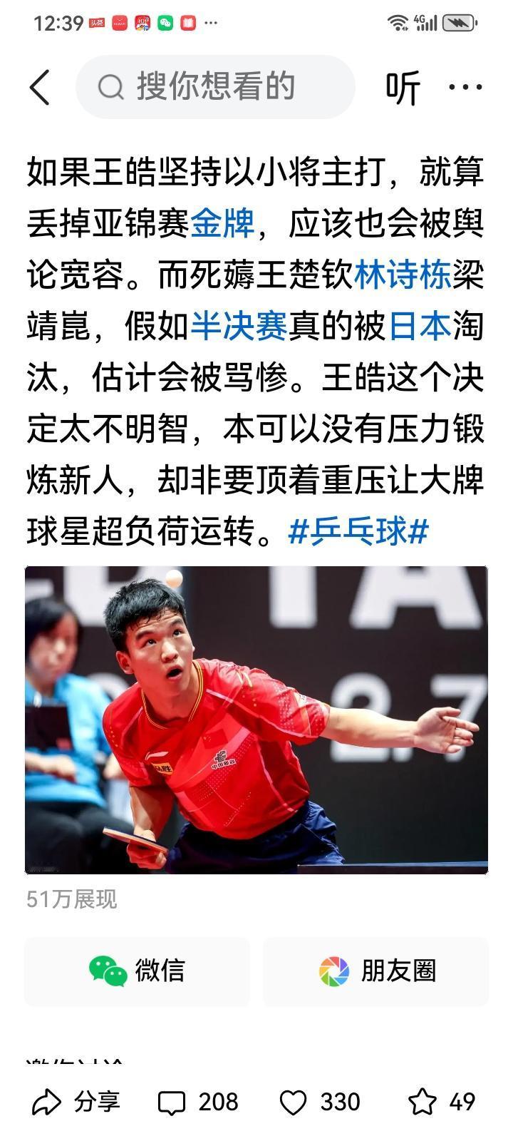 无理取闹,脸皮厚自以为是,睁着眼睛说瞎话,是喷国乒喷子的特点,不尊重事实,除了如果就是假如[捂脸][捂脸][捂脸] 如果林诗栋输了,中国队会0一3输日本[捂脸]如果王皓坚持让小将主打,就算丢掉亚锦赛金牌,应该会被舆论宽容[捂脸][捂脸] 假如半决赛,梁靖崑,王楚钦,林诗栋,真的被日本淘汰,估计会被骂惨,王皓这个决定不明智,本可以没有压力锻炼新人,却非要顶着重压让大牌球星超负荷运转。[捂脸][捂脸] 难道教练组不如外行喷子,中国的教练不明智中国乒乓球队能长期站在世界顶峰。 王皓指导比喷子们明智,什么都是假的得冠军才是真的,升国旗奏国歌才是国人想要的。 想锻炼年轻队员,一年多少商业赛锻炼不了,非的升国旗奏国歌的比赛上冒险,中国乒乓球队不会在升国旗奏国歌的比赛上锻炼新人,国家荣誉至上,升国旗奏国歌才是最重要的,这是民族尊严。