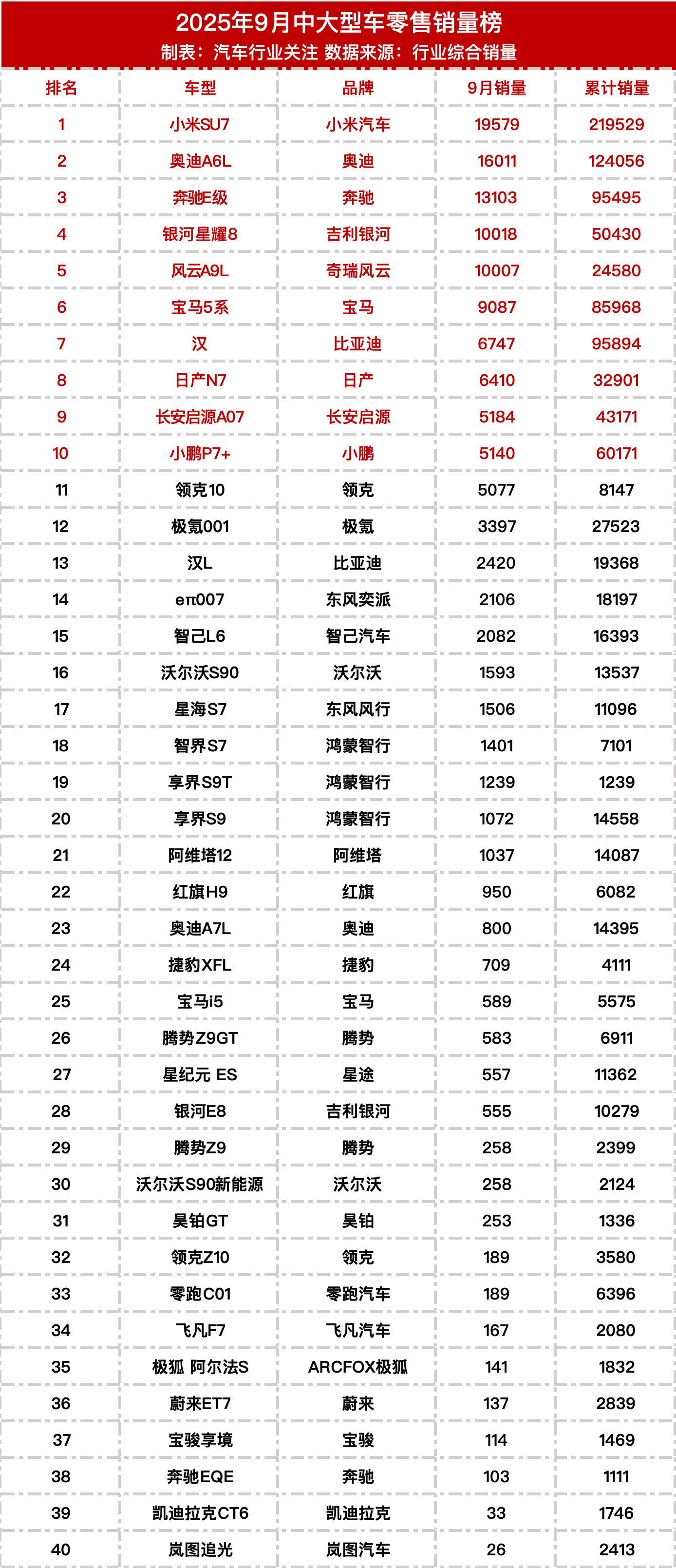 9月中大型车销量榜,SU7遥遥领先。