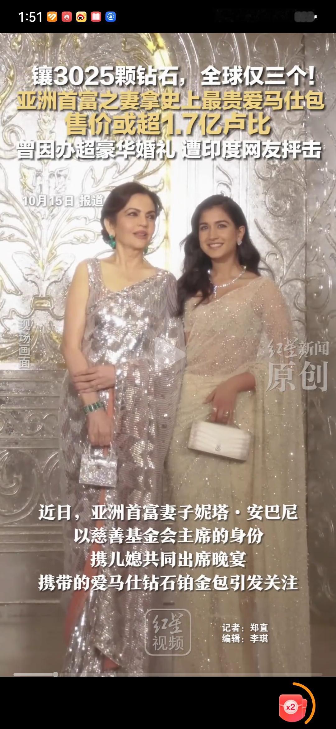 印度首富妻子携带全球限量三个,镶钻3000颗钻石的爱马仕包高调“炫富”你怎么看?