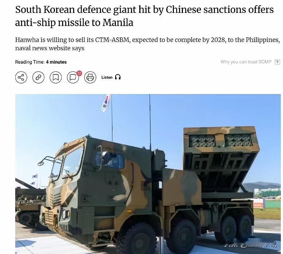 突发消息:韩国防务巨头韩华主动向菲律宾推销CTM-ASBM导弹。结合北京最近对韩