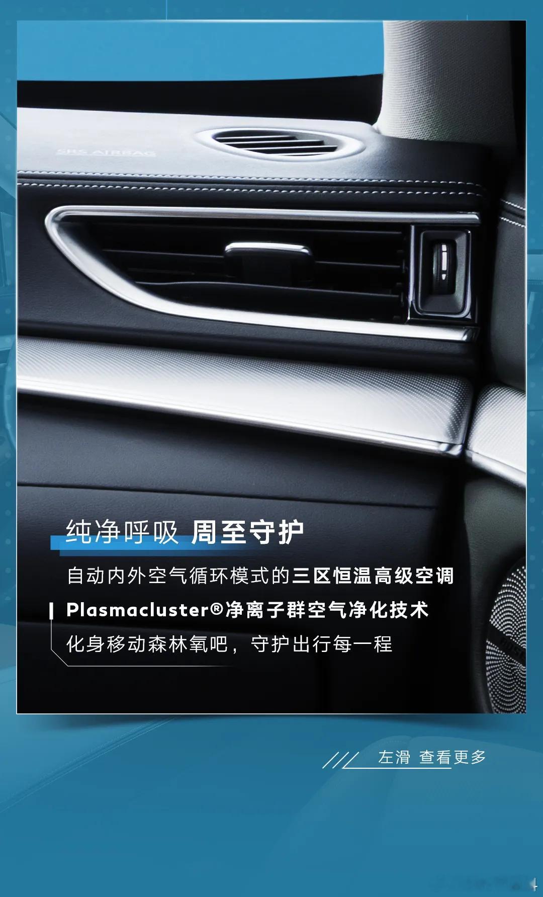 全车标配多向腰撑可调的电动座椅、17扬Bose至臻音响、三区空调带空气净化;后排支持140mm前后调节,后备厢容积565-1139L