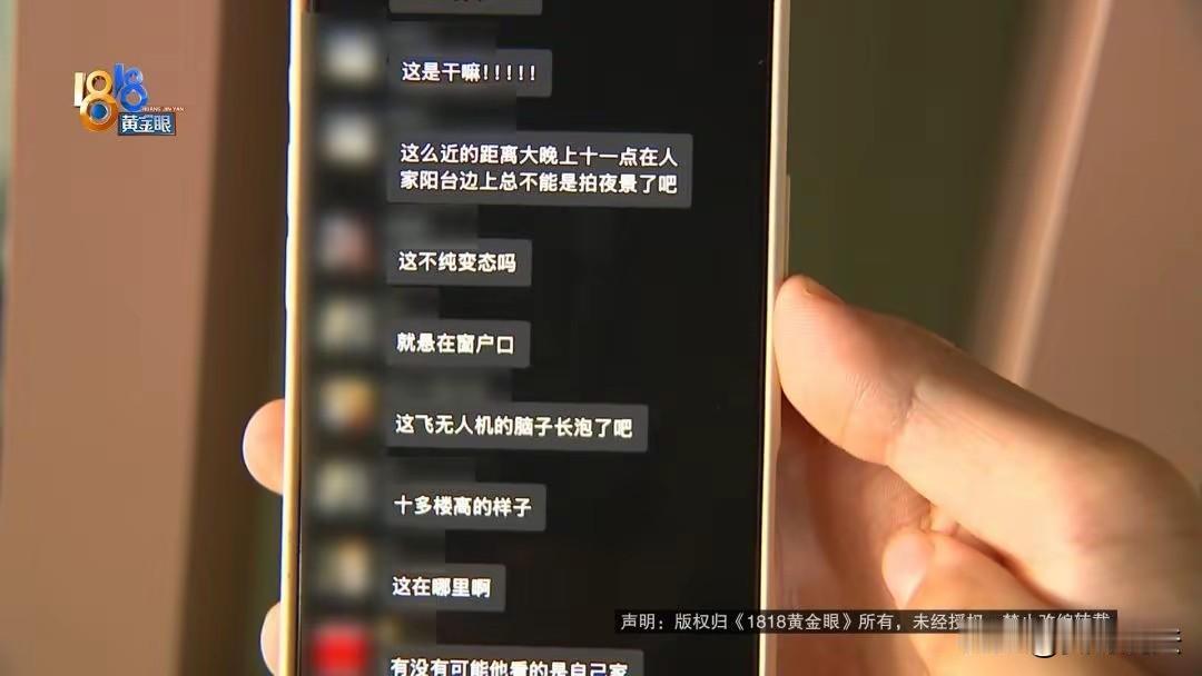 杭州萧山,一女子在家洗澡后来到阳台拿衣服穿时,却遭到无人机悬停偷拍。事后,女子找到无人机主,可对方表示他只是在拍风景。女子将情况反映到业主群里后,业主纷纷表示:“此前夜间就遇到过这种情况,在人家阳台边上,总不是拍夜景吧。” 据1818黄金眼报道,家住杭州萧山的黄女士最近遇到了一件让她尴尬的事情。 据黄女士表示,9月30日这天下午3点左右,她在家中洗澡后,随即来到阳台准备拿衣服穿。 就在这时,一架无人机悬停在阳台前,一动不动。 当黄女士看到这一幕,瞬间懵了,呆住在那。 等她反应过来后,便想喊男朋友出来,但无人机已经消失不见。 这番经历让黄女士感到非常尴尬,他们随即几经寻找,最终找到了无人机主。 无人机主却表示他没有偷拍,而是在拍远处的风景。 当然,黄女士没有实质性的证据,也无法证明这件事的事实。 后来,黄女士又得知邻居也曾经遇到过这样的事,还曾拍下了无人机于半夜11点在小区飞行的视频。 黄女士随即在业主群中反映这种情况,业主对此纷纷议论: “如果是白天拍风景还好说,大半夜的飞无人机总不是拍景吧!实在太可疑了。 也有业主表示,是不是他在拍自己的家呢? 黄女士认为,无论如何,这是一个涉及住户隐私的问题,物业必须要重视起来采取措施。 并不是不让无人机飞行,而是要有一定的底线,尽量去避开居民楼区。 对此,广大网友也同样存在质疑: “人家又不是刻意拍你,是拍风景回来,路过的,你自己洗完澡不注意,没有无人机,还有对面房子呢!” “穿衣服是件非常麻烦的事?如果真是如此麻烦,那又何必在乎不穿衣服惹出来的麻烦?别人不良、无德,该抓该罚!自己也应该有责任保护好自己吧。” 诚然,对于无人机主而言,在操纵无人机时应要有基本的底线,首先一点就是避免去窥探他人的隐私。 要知道,个人的隐私依法受到法律保护,任何人不得加以侵犯。 如果无人机主不是有意为之,双方把话说开,表达歉意,这事就算过去了。 当然,如果无人机主就是打着以拍风景的名义去拍摄小区住户的隐私,则其行为也可能涉嫌违法,依法要承担相应的责任。 对于像黄女士这样住户来说,也格外要注重隐私。 毕竟在洗完澡后,如果没有采取措施的情况下,来到阳台上还是存在隐私泄露风险的。 对此,你怎么看呢?欢迎大家在评论区留言。