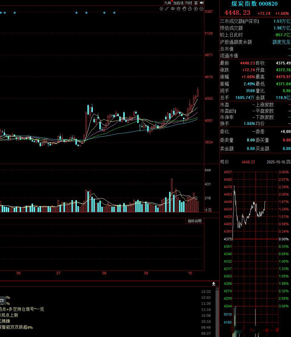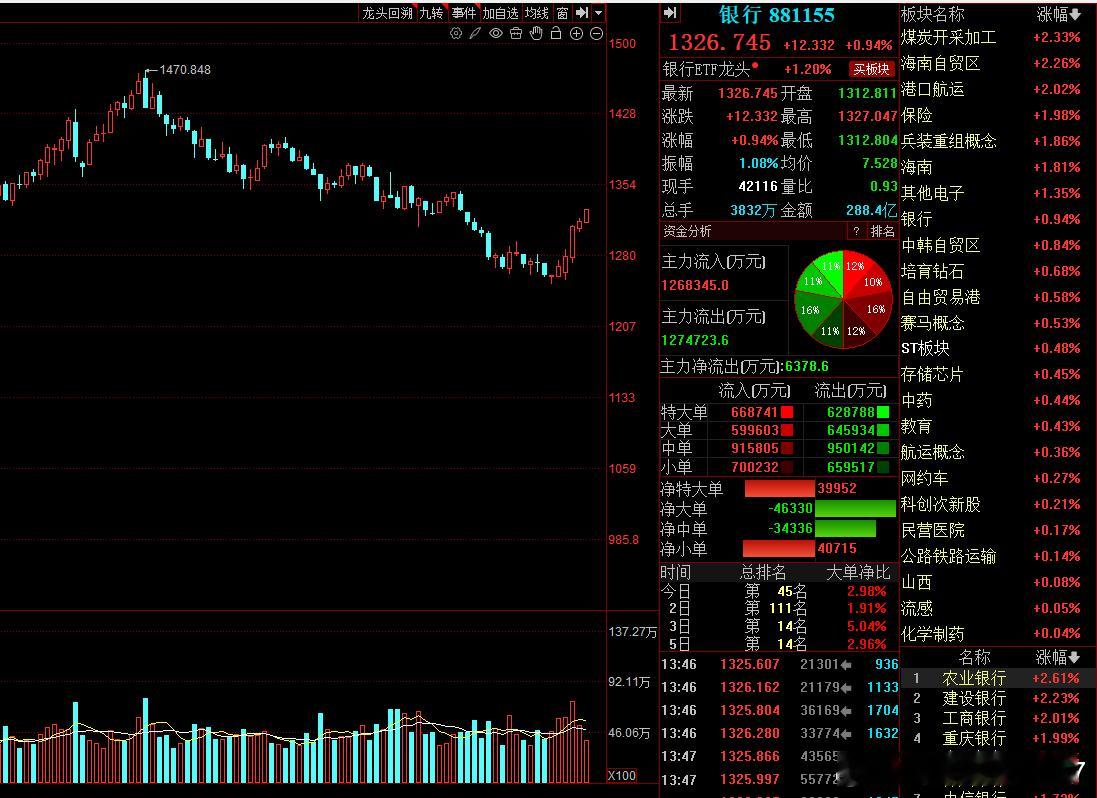 这几天的行情最大的特点是银行5连阳,农行甚至都快新高了。煤炭也持续涨