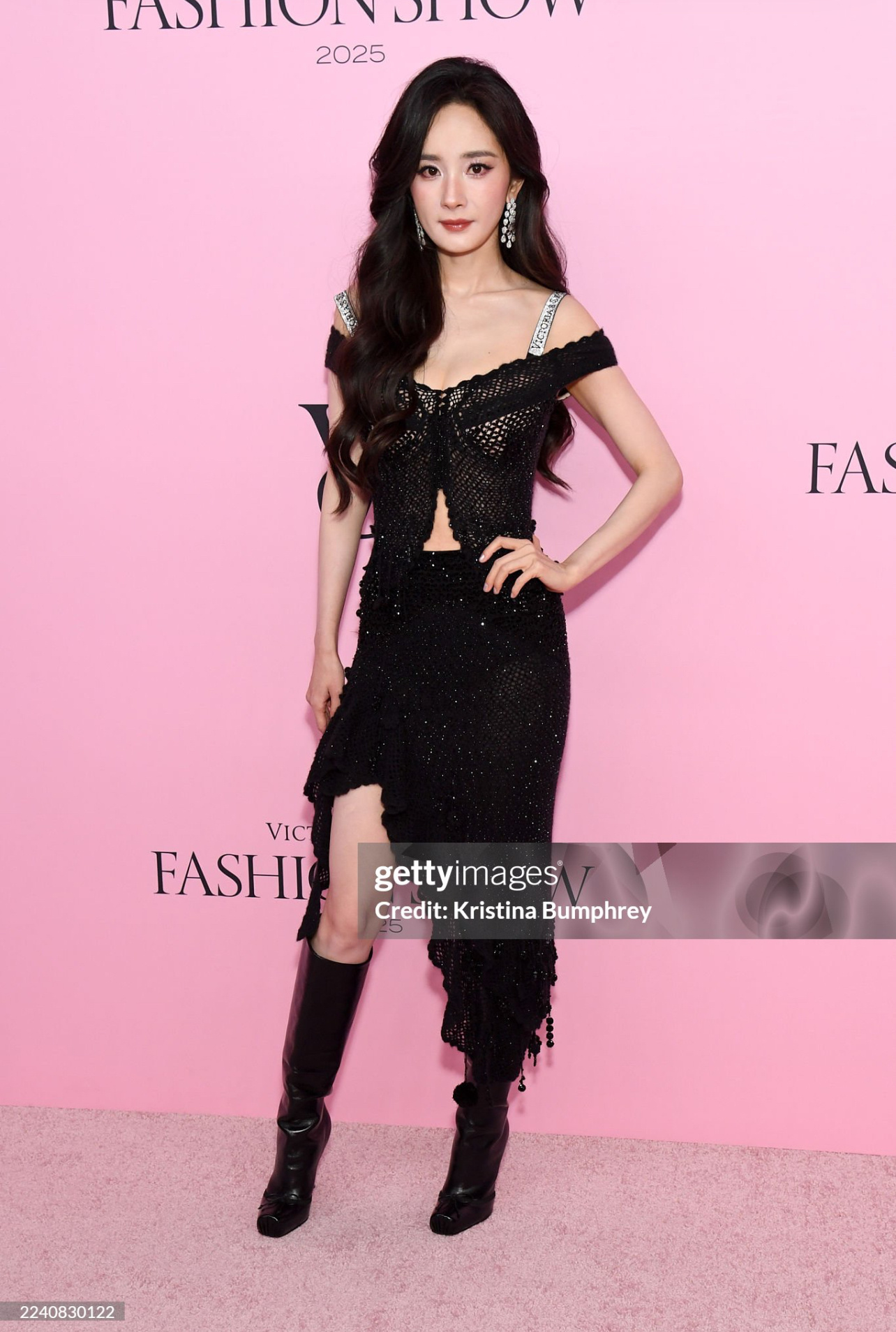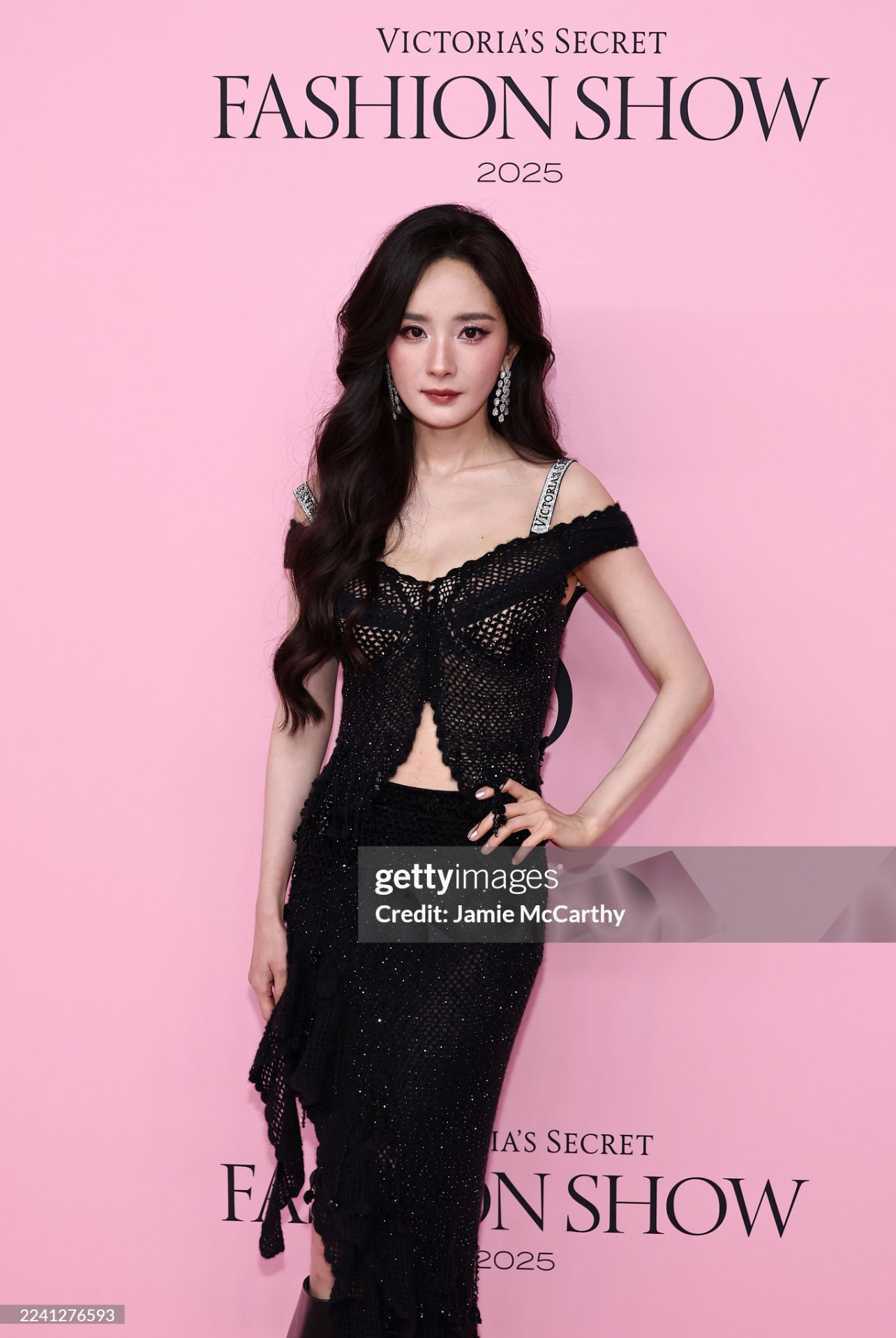 杨幂身着Ulyana Sergeenko 2025春夏高定系列黑色镂空裙装,以亚洲区品牌代言人首度亮相维密大秀~