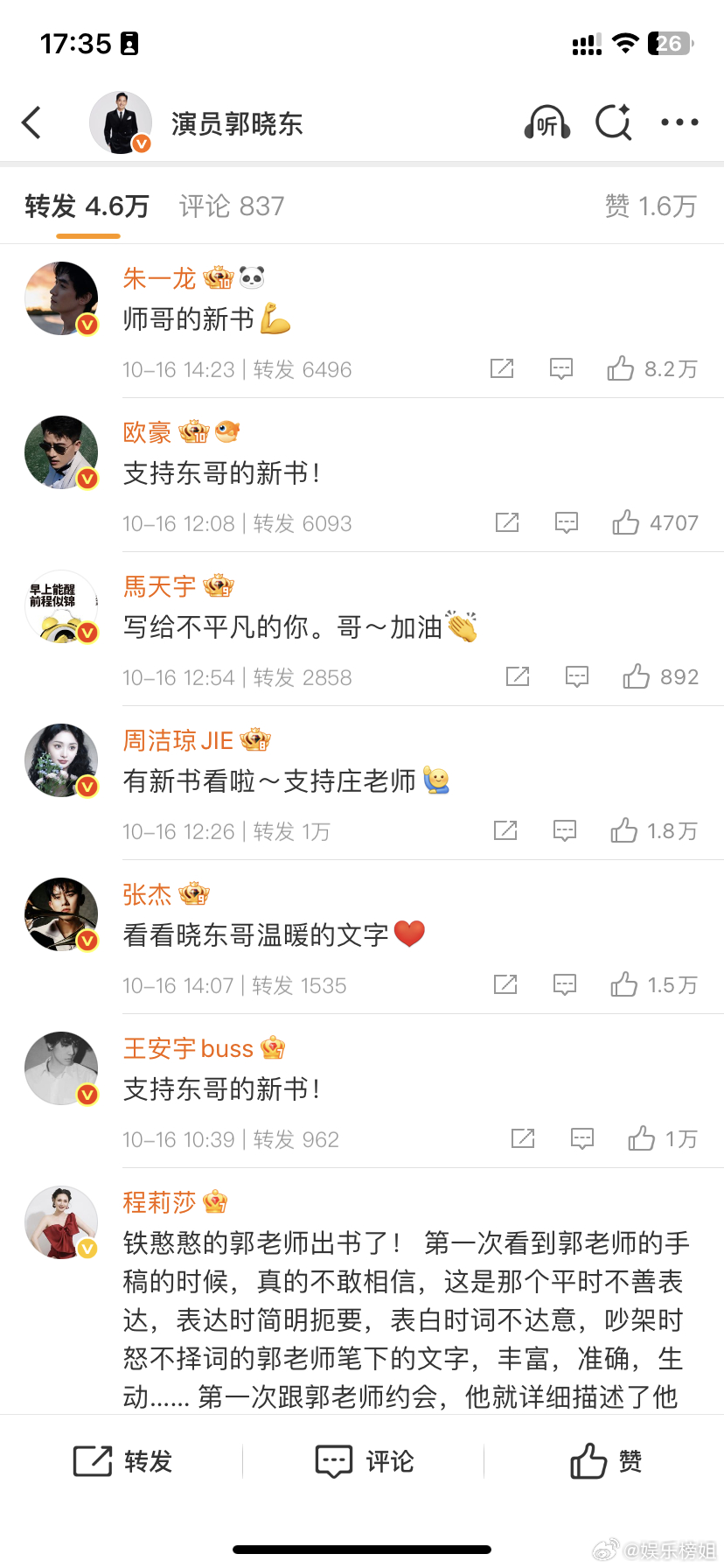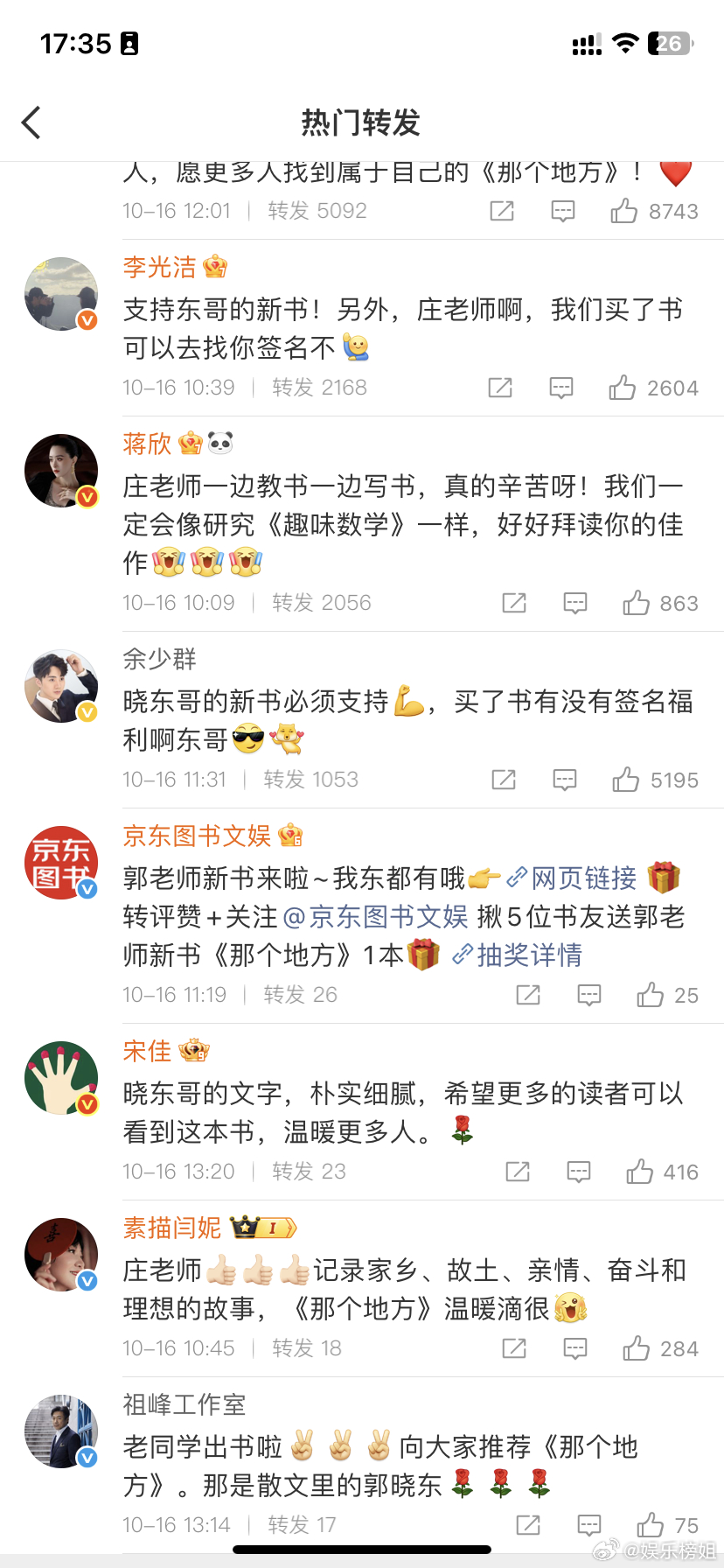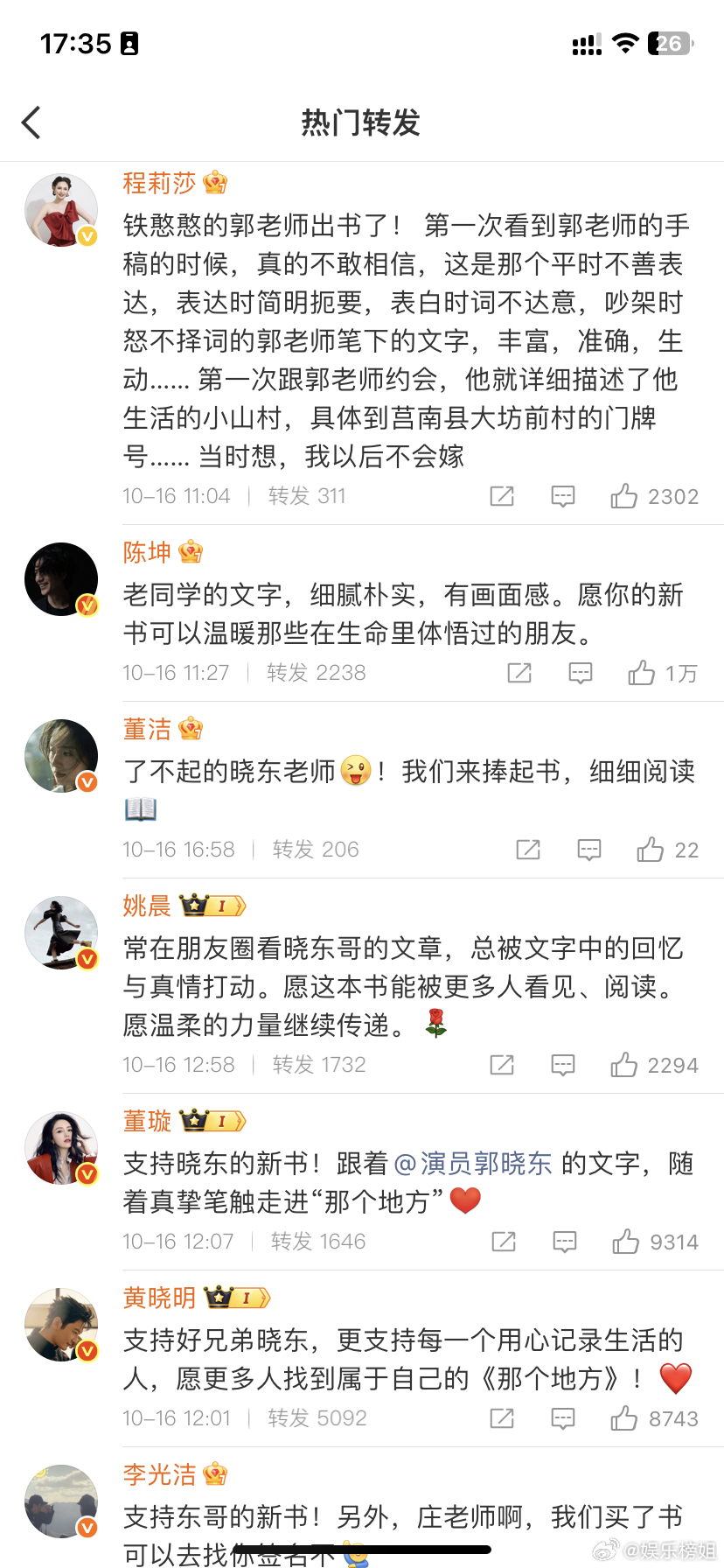 郭晓东人脉郭晓东老师的新书《那个地方》出版,朱一龙 宋佳 姚晨 欧豪 闫妮 蒋欣 王安宇 李光洁 周洁琼 张杰 董璇 董洁 黄晓明 马天宇 陈坤等圈内好友都来转发帮忙宣传支持!郭晓东圈内人缘真不错!