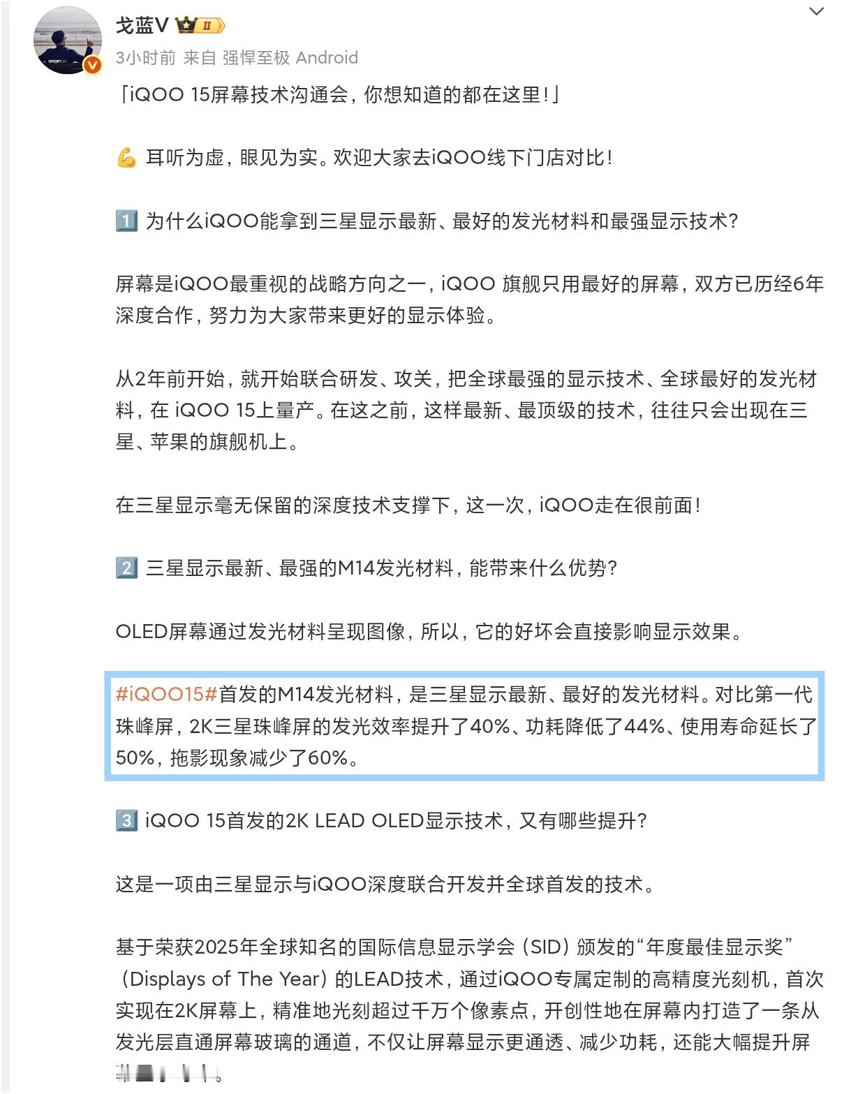 今天iQOOX三星屏幕技术沟通会也解答了iQOO15三星M14顶级2K屏相关问题,省流版: