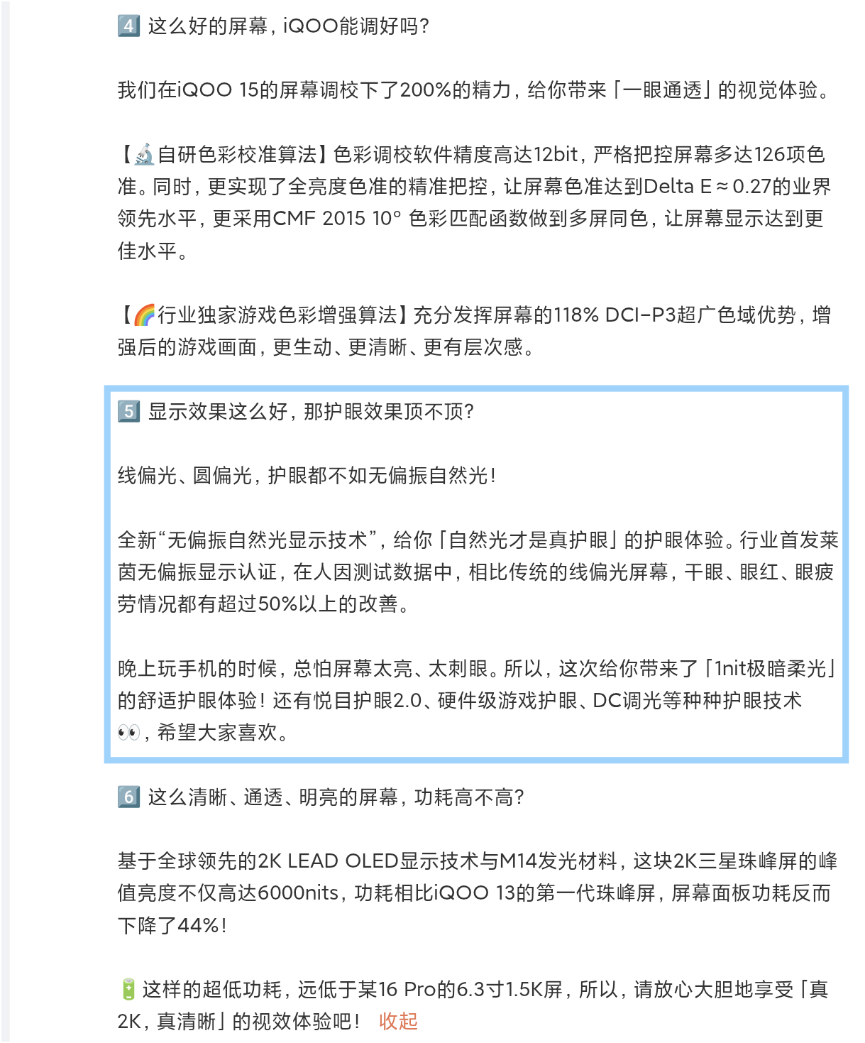 ●iQOO旗舰坚持选择行业最好的屏幕,所以iQOO15定制三星旗舰屏,达到对标三星苹果的水准;