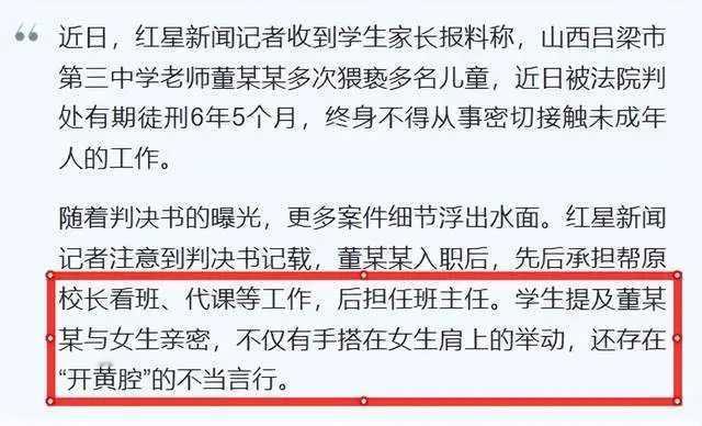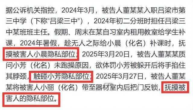 终身禁业!山西一中学教师多次猥亵学生获刑,仅凭自荐信入职,手机藏不雅内容引追问 “作为父亲,我换衣服都避开孩子,他竟敢这么做!”山西吕梁的李先生攥着判决书,声音因愤怒而颤抖。近日,吕梁市第三中学教师董某某因多次猥亵多名学生,被法院判处有期徒刑6年5个月,且终身不得从事密切接触未成年人的工作。随着判决细节曝光,这起案件背后的招聘漏洞与监管缺失更令人揪心。 讲台变“陷阱”:“优秀教师”的隐秘恶行 2024年3月,董某某入职吕梁三中,凭借“教学成绩优秀”很快升任班主任,不少学生甚至崇拜地称他“很厉害”。但这份“光环”下,藏着不可告人的龌龊。 判决书揭露,董某某的恶行遍布教室、补习室与器材室:2024年暑假,他趁补课独处之机抚摸学生小晨隐私部位;2025年3月,因学生小芳未跑操,他掐住其脖颈并触碰隐私部位;仅一周后,又将小丽骗至器材室反锁房门实施猥亵。更令人发指的是,他竟在随时可能有人进出的教室实施侵害,法院认定其属“公共场所当众犯罪”,情节极其恶劣。 直至2025年4月,两名学生家长报案的消息传开,李先生追问女儿后才揭开更多黑幕:女儿曾被董某某掐脖、摸腿,他还常对女生“开黄腔”。“孩子起初不敢说,现在成绩一落千丈,我们全家都失眠。”李先生的遭遇,是多个受害家庭的缩影。 手机藏证:不雅内容与“零门槛”入职的荒诞 庭审中,董某某始终不认罪认罚,但证据链早已锁定其罪行。警方从他手机中提取的内容令人震惊:与未成年女性聊天出现“避孕套”等敏感词汇,还存有裸体照片,且与8名女性的对话充斥“老公”“性生活”等露骨表述。 更荒诞的是董某某的入职经历。这所市直属公办中学竟仅凭一份自荐信,就将他录用为代课教师,随后升任班主任。事发后,学校坦言“仅找到自荐书,其他证件、证明未知”,而此前还曾出具说明称其“师德师风无不当”。 “公办学校招聘能这么随意?”李先生直指校方违规,“正是这种漏洞,让恶魔混进了校园。”目前,受害家庭已提出赔偿诉求,但记者致电吕梁市教育局人事科核实招聘流程,电话始终无人接听。 终身禁业难平痛:校园防线如何筑牢? 法院最终认定,董某某作为负有特殊职责的教职人员,多次猥亵儿童且情节恶劣,依法判处其有期徒刑6年5个月,并终身禁止从事密切接触未成年人的工作。这一判决呼应了司法实践中对性侵未成年人犯罪的严惩导向——此类行为隐蔽性强、危害深远,必须用重刑震慑,用从业禁止阻断再犯可能。 如今,妇联与政府虽提供心理辅导,但孩子们心中的创伤难以磨灭。这起案件更敲响警钟:当“教师短缺”成为招聘缩水的借口,当“教学优秀”掩盖了师德审查的缺位,校园安全便会出现致命漏洞。截至发稿,涉事学校与教育部门尚未就招聘问题作出回应,而公众等待的,不仅是对受害者的赔偿,更是对校园招聘流程的彻底排查与整改。