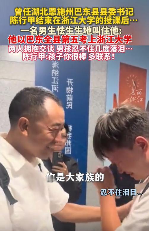 陈行甲在浙江大学授课,遇到了一个来自巴东的学生,陈行甲问他的名字以及名次,很激动的和这名男生交流。 2025年10月,浙江大学校园里的一次偶遇,点燃了网友的情绪。前湖北巴东县领导陈行甲在浙大授课期间,被一名来自巴东的男生轻轻唤了一声“陈书记”。 那一刻,两人之间没有身份落差,只有牵挂与共鸣。 这位男生名叫向东升,是巴东县2024年高考全县第五名,如今就读于浙江大学。他怯生生地站在走廊里,声音不大,却足以让陈行甲瞬间转身,眼眶湿润。 陈行甲任内以铁腕反腐、推动“农民办事不出村”等改革闻名,被网友称为“网红书记”。 卸任后他投身公益与教育,但始终没有忘记那片曾倾注心血的土地。向东升的出现,像一面镜子,照见了他当年在巴东所做一切的意义——不是为了政绩,而是为了让山里的孩子有机会走出大山,看到更广阔的世界。 向东升来自巴东一个普通家庭,父母务农,家中并不富裕。他靠全县第五名的成绩考入浙大,背后是无数个挑灯夜读的夜晚。而当他站在浙大走廊,喊出那一声“陈书记”时,不只是认出了一位旧日父母官,更是喊出了一个寒门学子对改变命运的感激与确认。 陈行甲没有多问成绩,而是紧紧抱住这个孩子,像拥抱自己失散多年的孩子。向东升当场落泪——不是因为委屈,而是因为被看见、被认可。 在大城市里,他或许只是万千新生中普通的一员,但在陈行甲眼里,他是巴东的骄傲,是教育公平最真实的注脚。 这种情感的流动,远比任何演讲或口号更有力量。 它说明了一个朴素的道理:真正的改变,从来不是靠宏大的叙事,而是靠一个个具体的人被托举起来。 从巴东到杭州,直线距离超过1500公里,但对向东升这样的孩子来说,这段路远不止地理意义上的距离。 巴东地处鄂西山区,教育资源有限,很多孩子连一本像样的课外书都难找。 陈行甲主政期间,大力推动教育投入,改善乡村学校条件,鼓励优秀教师下沉。他深知,只有教育才能真正斩断贫困的代际传递。 如今,向东升站在浙大校园,正是当年那些努力结出的果实。这不是偶然,而是一场持续多年的“长线投资”终于有了回报。 更令人动容的是,陈行甲在拥抱向东升之后,立刻想到的是“还有没有其他巴东的孩子在浙大?”他当场表示要联系学校,看看能不能组织一次小型聚会,见见所有来自巴东的学子。 他曾说:“我在巴东时,最怕看到孩子眼神里没有光。”如今,向东升眼里的光,就是对他当年坚持最好的回应。 很多人可能不理解,一个已经离开体制的人,为何还对昔日治下的孩子念念不忘?他从未把巴东当作“任职地”,而是当作自己的第二故乡。 卸任后,他没有选择隐退,而是继续通过写作、演讲、授课等方式,传递对公平与教育的信念。这次在浙大的偶遇,不过是这种信念在现实中的又一次自然流露。 寒门还能否出贵子?教育是否还能改变命运? 向东升的成绩并非顶尖,全县第五名在超级中学动辄几十个清北的背景下,似乎并不耀眼。但正是这种“普通优秀”,才更具普遍意义。 大多数孩子不是天才,他们靠的是日复一日的坚持,是在资源有限条件下拼尽全力的突围。陈行甲拥抱的,不只是向东升一个人,而是千千万万像他一样默默奋斗的寒门学子。这种共情,超越了地域、身份和时间。 如今的陈行甲,鬓角已染霜白,不再有当年“网红书记”的锐气,但眼神里的坚定丝毫未减。 向东升的喊话,不只是对一个旧日官员的称呼,更是对一种价值的确认——有人曾为你拼命铺路,你才有机会走到今天。 而陈行甲的拥抱,则是一种承诺的延续:只要还有孩子愿意读书,就永远有人愿意为他们点亮一盏灯。 信息来源: 美丽浙江 2025-10-16 陈行甲在浙大碰到了老多