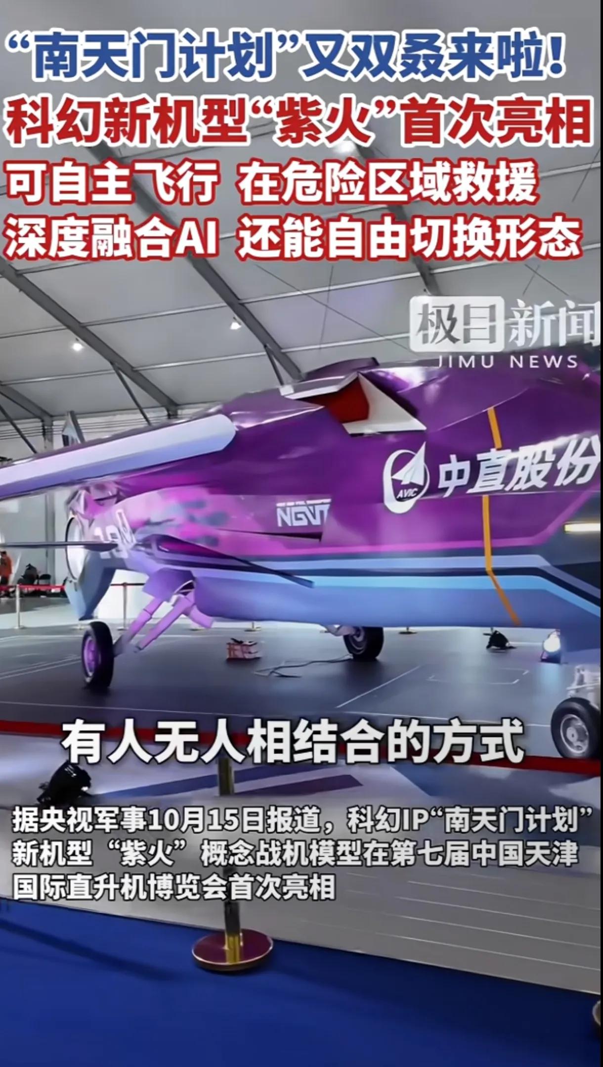 六代机也不香了?东大“紫火”亮相天津:能变形还能战太空,鹰酱还在啃PPT[捂脸] 10月16日,天津国际直升机博览会上,“南天门计划”推出的“紫火”垂直起降战机,以科幻的外型,惊艳亮相! 要先明确的是,它目前还处于新概念研发阶段,原型机预计2030年前后才能亮相,并非已成型的装备,但设计思路,已经跳出了传统战机的框架。 从构想来看,“紫火”的亮点很清晰:能实现VTOL垂直起降,不用依赖长跑道,部署起来更灵活。 还能在直升机低速模式和固定翼高超音速模式间切换,动力用的是“脉冲爆震发动机” 这种发动机靠燃料周期性爆震产生推力,推重比,比传统发动机更高上许多,理论上能适配大气层内外的飞行环境。 紫火的隐身设计,也考虑得很全面,不只能防雷达探测,甚至加入了光学隐身的思路!(降低肉眼可见度) 功能上更突破,计划承担“空天电子战”任务,比如干扰敌方卫星、切断远程通信,把作战范围往空天延伸。 反观鹰酱,这些年喊着“空天作战”的口号,却始终围着F系列战机打转。 要么给F-35贴“空天适配”的标签,实际连高超音速飞行都没达标。 要么推出“下一代空天战机”PPT,列了一堆参数却没见实体原型机动静。 去年公布的“空天电子战计划”,还停留在“联合盟友搞技术调研”的阶段,连具体动力方案。都没敲定。 两相对比,看来再想摸着鹰酱过河,是不可能了![呲牙][呲牙]