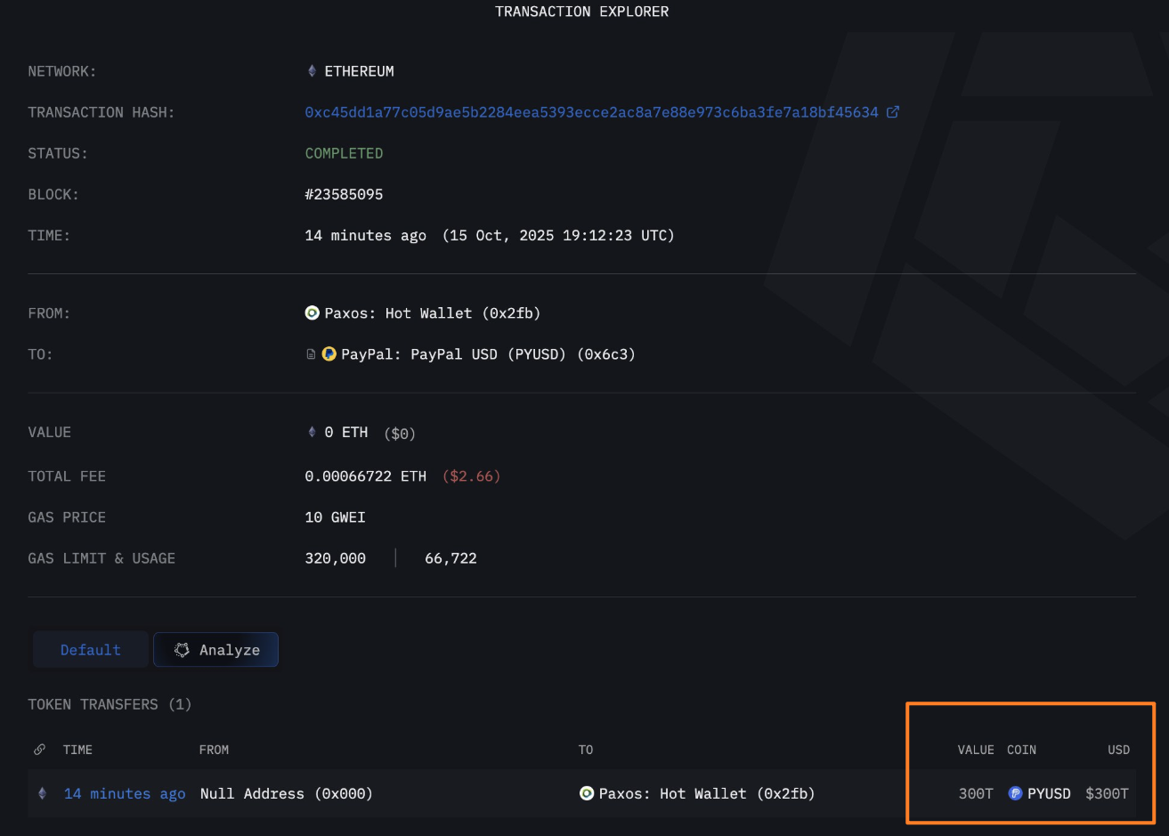 交易记录显示,Paxos随后按照常规操作铸造了3亿枚PYUSD。所以这起事件的全貌并不难猜:Paxos将3亿(300million)错误打成了300万亿(300trillion)。