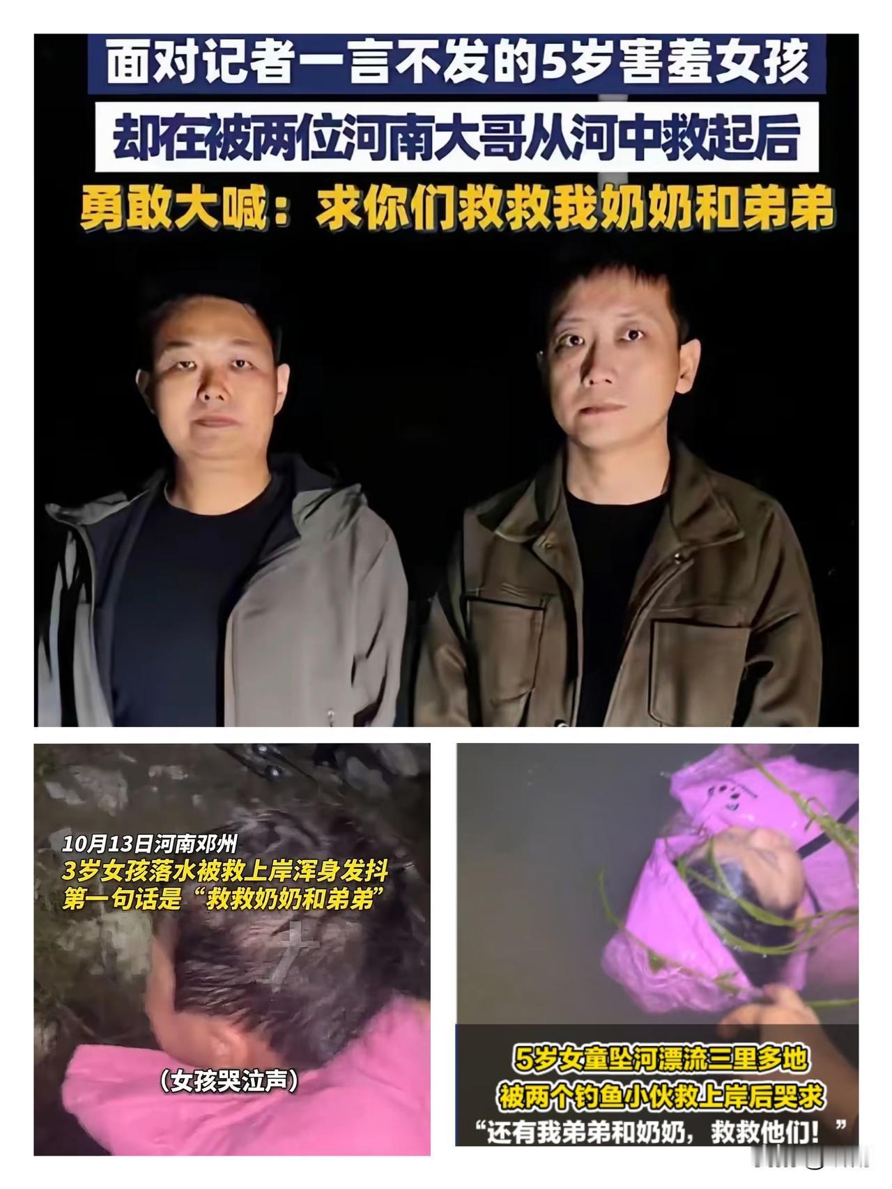 河南邓州这场救援,藏着最动人的人性光辉! 黑漆漆的夜里,陡岸急流中飘着个挣扎的小身影,换谁不发怵?可王佩和刘力没跑,头灯一照发现是落水女童,急得直冒汗。岸陡水急不敢贸然下水,他俩急中生智举起步路亚竿,一次次抛钩终于钩住了孩子的衣服。 拉上岸时孩子浑身冰凉,可第一句竟是哭喊着救奶奶和弟弟,这懂事劲儿看得人鼻酸。后来才知祖孙四人过桥落水,她被冲了三里多地,偏偏遇上了这两位好心人。 你们说,这份跨越三里水路的缘分,是不是比任何奇迹都动人?你身边见过这样的暖心时刻吗?小女孩能在漂流三公里后还活着,这简直就是奇迹啊!而这个奇迹,多亏了这两位钓鱼的好心人。 在这里,必须给这两位钓鱼的好心人点个大大的赞,你们用善良和勇敢诠释了人性的光辉,好人一定会有好报!