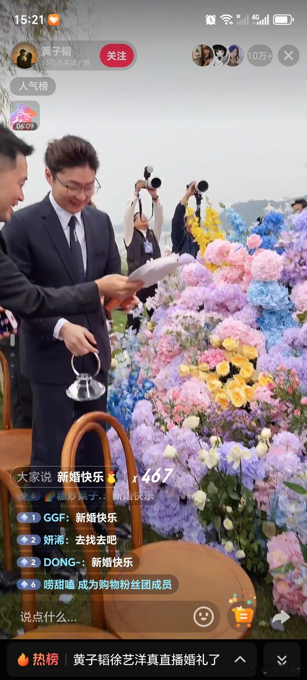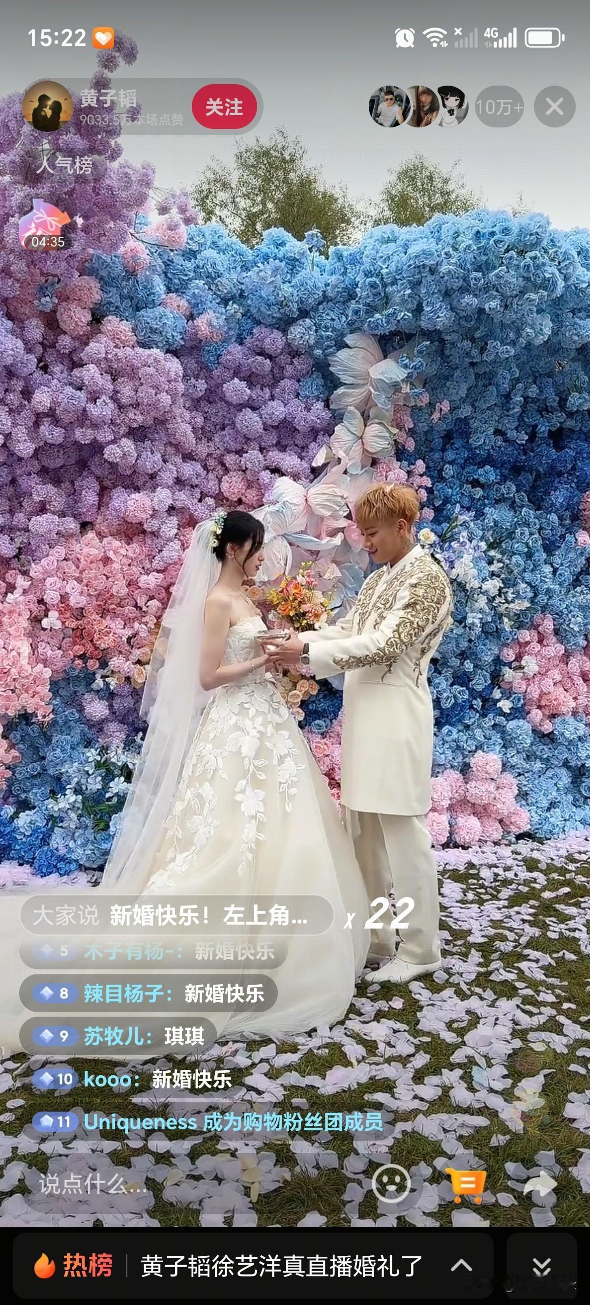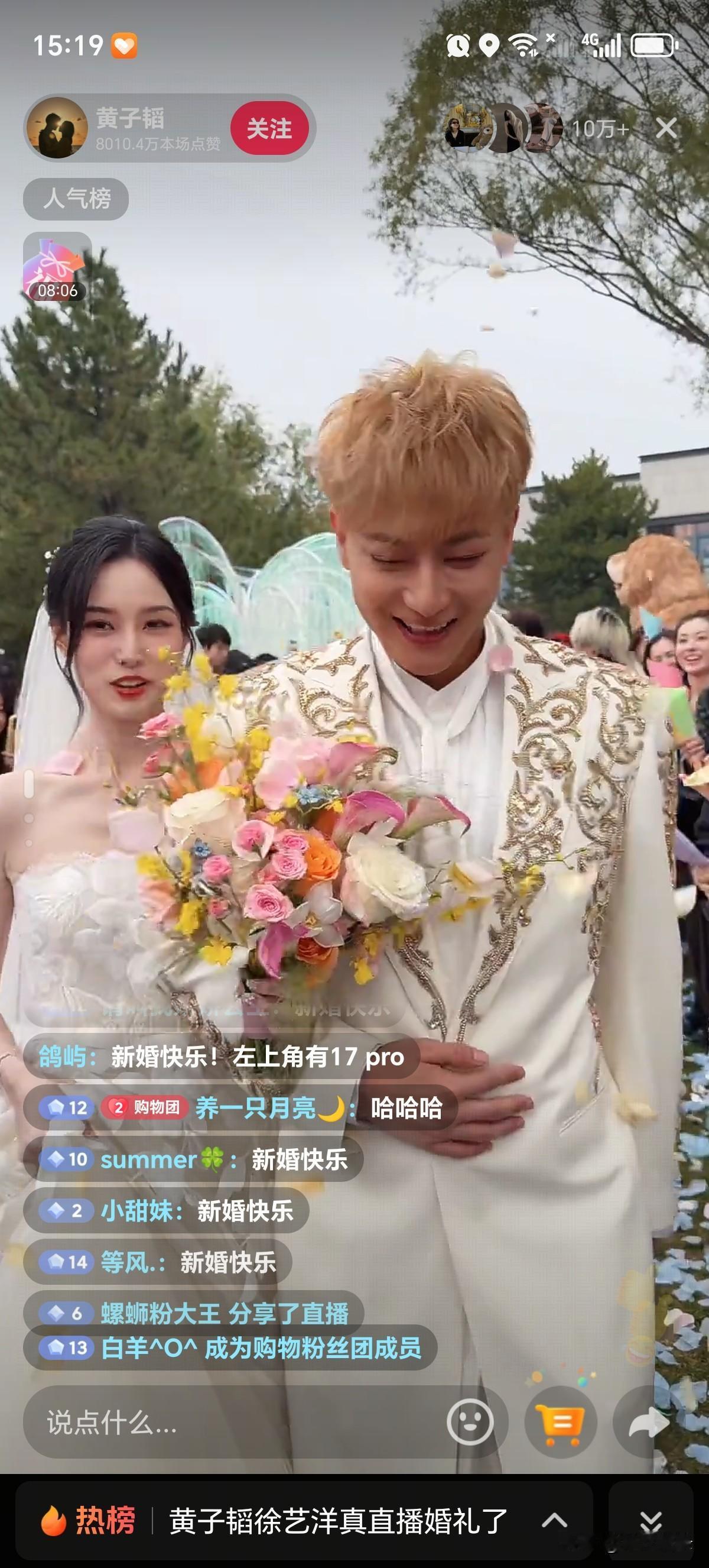 今天在黄子韬直播间抢手机,都是苹果17,只是人太多了,没有抢到。 黄子韬和徐艺洋的婚礼有几点想不到? 第一:黄子韬准备了40辆豪车接亲。 第二:没有伴郎和伴娘,改成了亲友互动环节。 第三:黄子韬准备了500克的钻戒,藏在花丛中,要现场的亲友找出来的,互动环节很有趣,钻戒有拳头那么大 第四:新娘子抛花,第一个抢到的人竟然是徐艺洋的外甥,而且还是刚从部队回来。 我觉得没有伴郎伴娘也好,还记得包贝尔结婚,柳岩被捉弄了事吧!少了伴郎和伴娘,增加亲友的互动,亲友互动更有趣,再次恭喜黄子韬和徐艺洋,新婚快乐。黄子韬夫妻 黄子韬夫妇