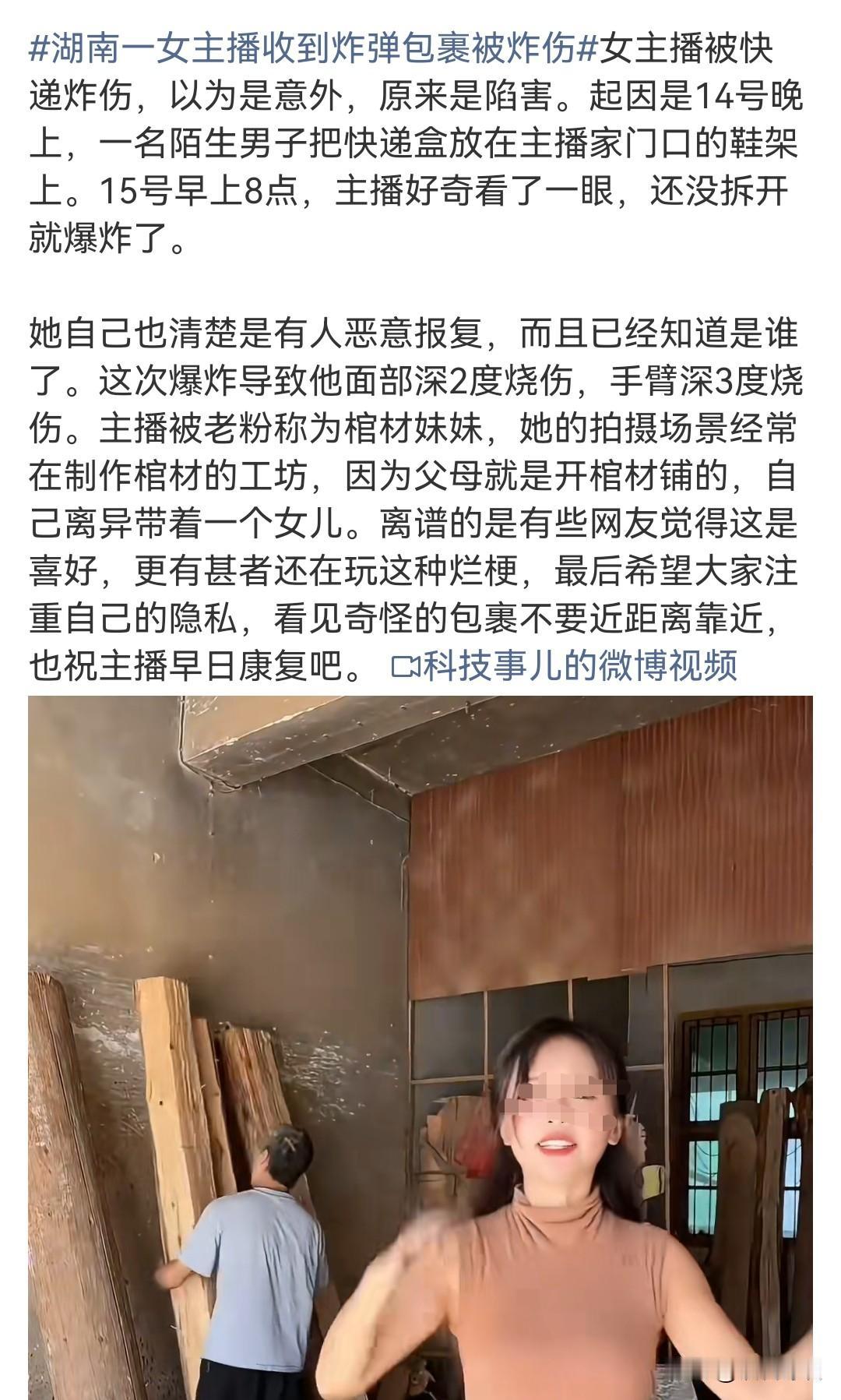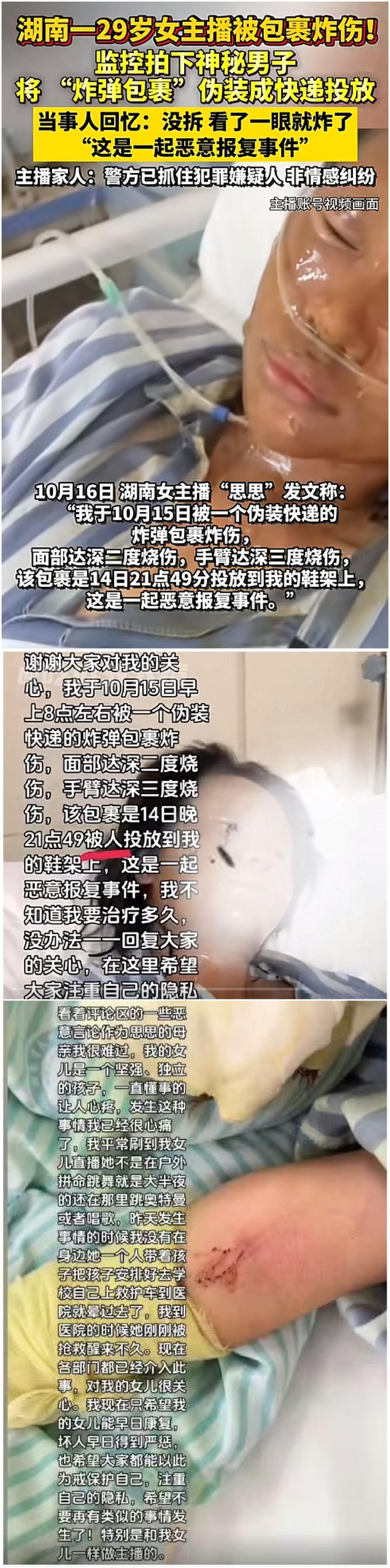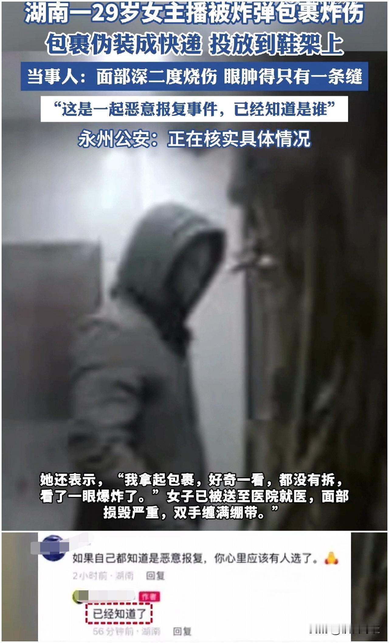 挺漂亮的一女主播遭殃了,真是知人知面不知心,防人之心不可无! 10月14日晚,湖南永州一女主播竟然遇到了快递炸弹,虽然性命无忧,但也严重烧伤,想必后续与美丽漂亮无缘了! 虽然该女主播的赛道有点小众,但看上去也不至于让人妒忌。 不过从官方和女主播个人发声来看,女主播认识送快递的,而且对方已被控制,想必他必将受到严惩,毕竟炸弹这种东西危害还是很大的,而且怎么做出来的是不是有相应的黑产业链也要深究一下! 但女主播受到的伤害已然很难挽回,所以还是提醒所有人,知人知面不知心,不要轻易透露地址给他人,即使对方是榜一大哥也得慎重!