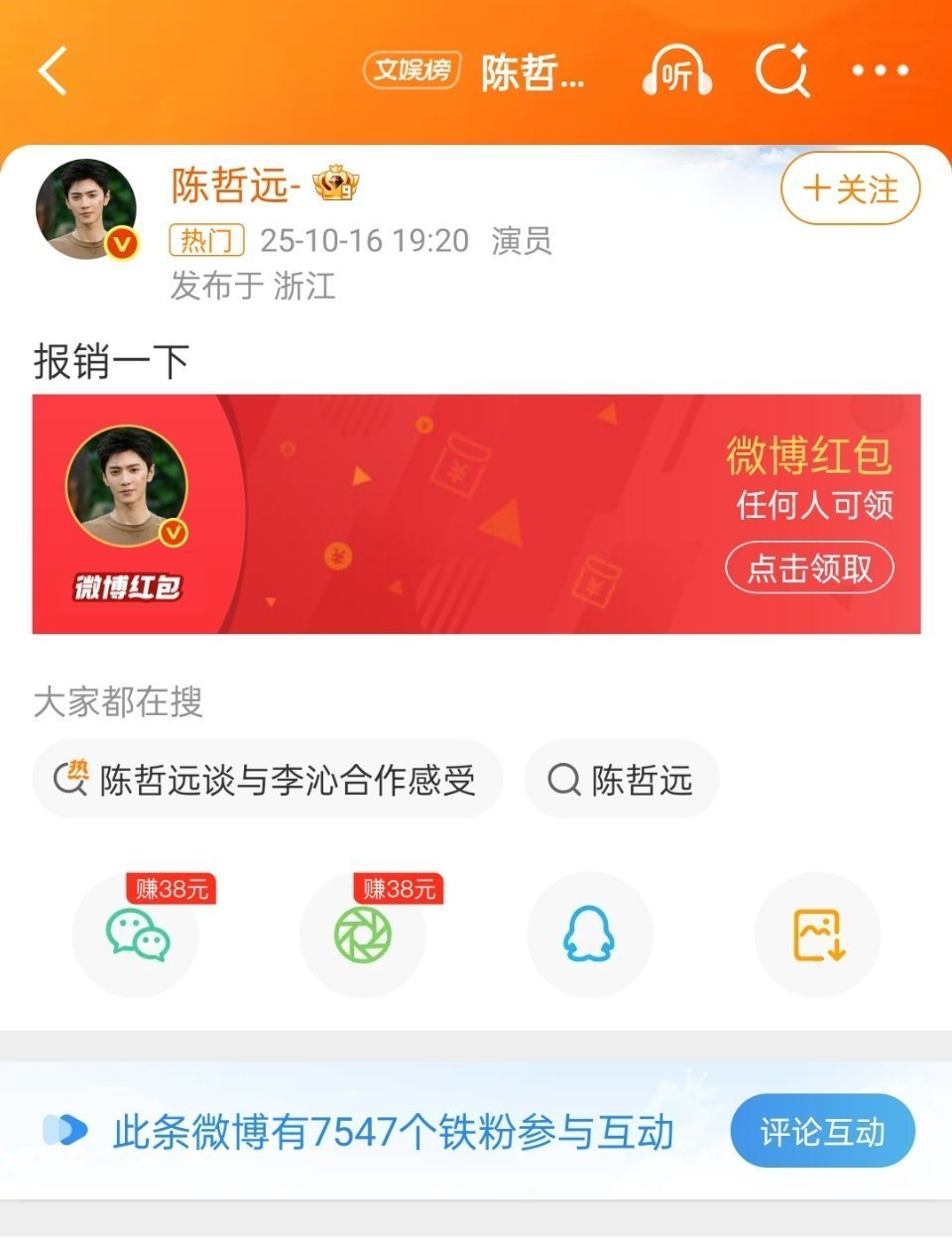 陈哲远感谢粉丝云包场给粉丝发红包“报销一下”!陈哲远真的是内娱最爱给粉丝发红包的人了吧,每年过年都有大额红包[点赞]