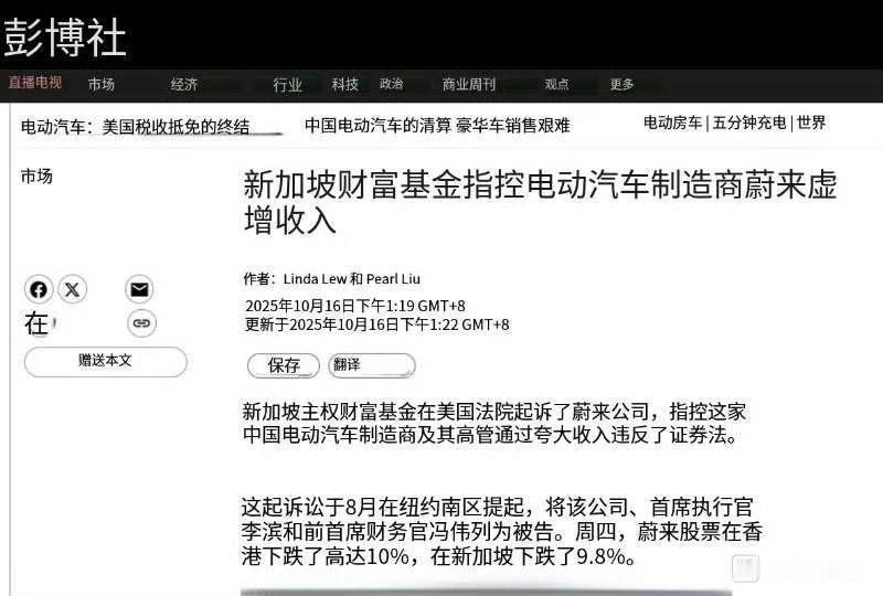 新加坡政府投资公司指控蔚来收入虚增,股市已经跌超10%了。