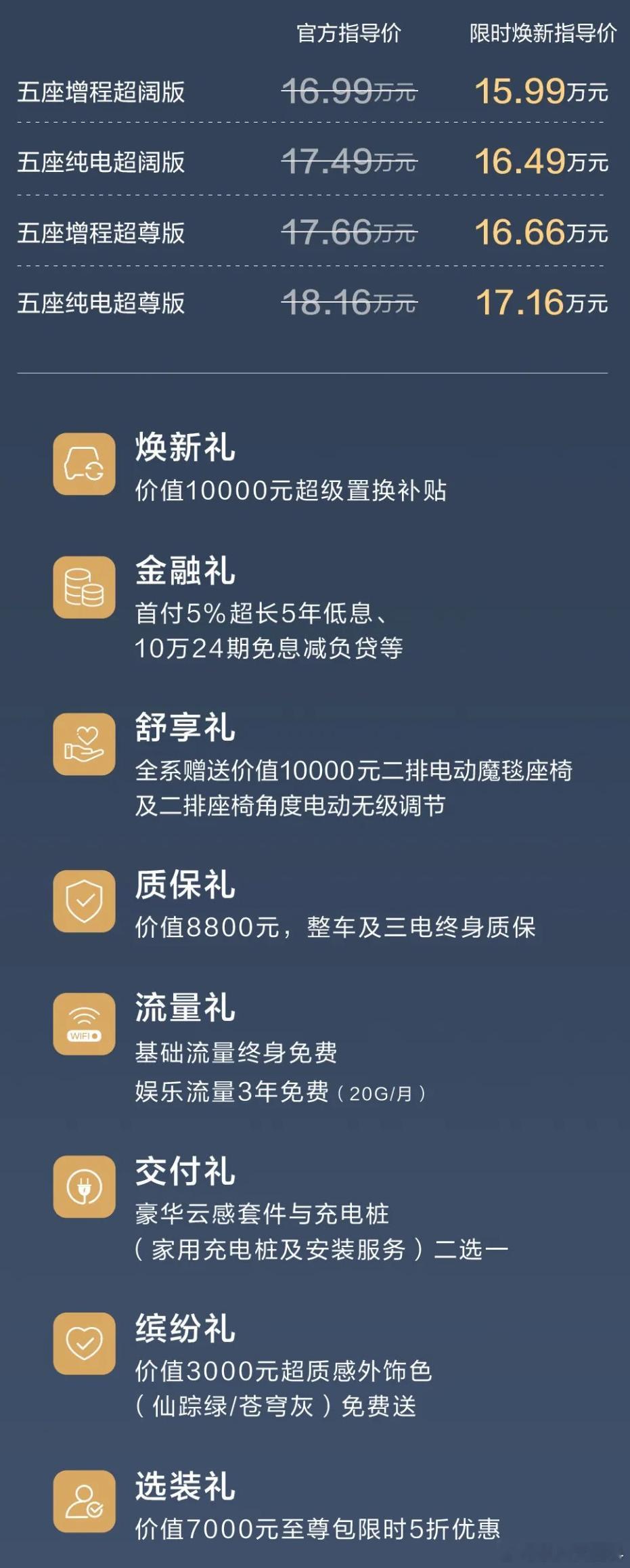 至于eπ008五座版,全系4款车型,限时焕新售价15.99-17.16万元,并且全系赠送二排电动魔毯座椅、6.5L冷暖箱(5/50℃)、方向盘加热、21吋圈等配置