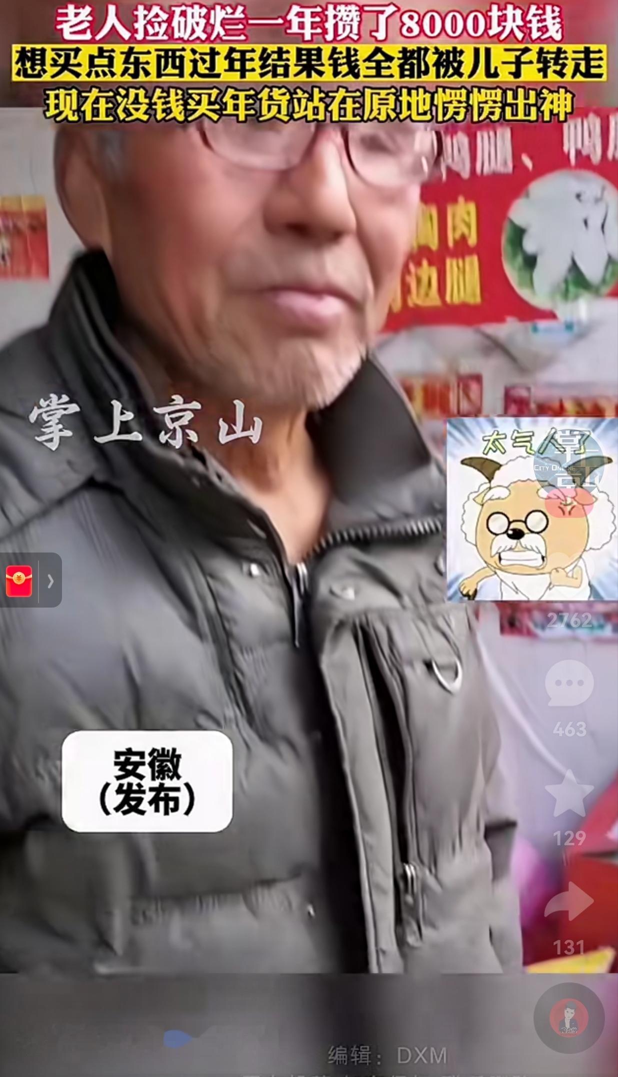 养了一个白眼狼!老父亲年龄这么大了,没有什么劳动力了,你怎么敢呀! 老人捡破烂,辛辛苦苦一年攒了8000块钱,想着过年买点东西,谁知道儿子翻箱倒柜,把自己所有的积蓄全部转走了! 等老人发现后,问儿子要钱的时候,儿子却说,你的钱被我花光了,我手头一分钱也没有,你看着办吧? 老人看到自己的儿子这般无赖,也没有办法,只能默默忍受。 再看看老人无助的样子,真的还挺心酸的。 网友看到后评论说,养了一个不孝子,看着老人好痛心,希望你的孩子良心发现,给父母买点实用的! 还有的网友说,这儿子真不孝顺老父亲年龄这么大了,你不仅不给老父亲钱,还顺手牵羊将老父亲辛辛苦苦挣来的血汗钱都拿走了,这是人干的事情吗? 人们都说,养儿防老!这儿子真的是白眼狼,一点也不知道报答父母的养育之恩,甚至都到现在了,还在啃老呢?真的一点良心也没有。 人心都是肉长的,你也不看一看你的老父亲年龄多大了?他还能干的动吗?难道你非要给老父亲吃干抹净吗? 希望你早点迷途知返,别再祸害老父亲了,让你的老父亲安享晚年吧?