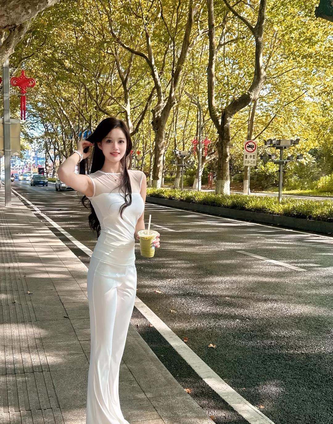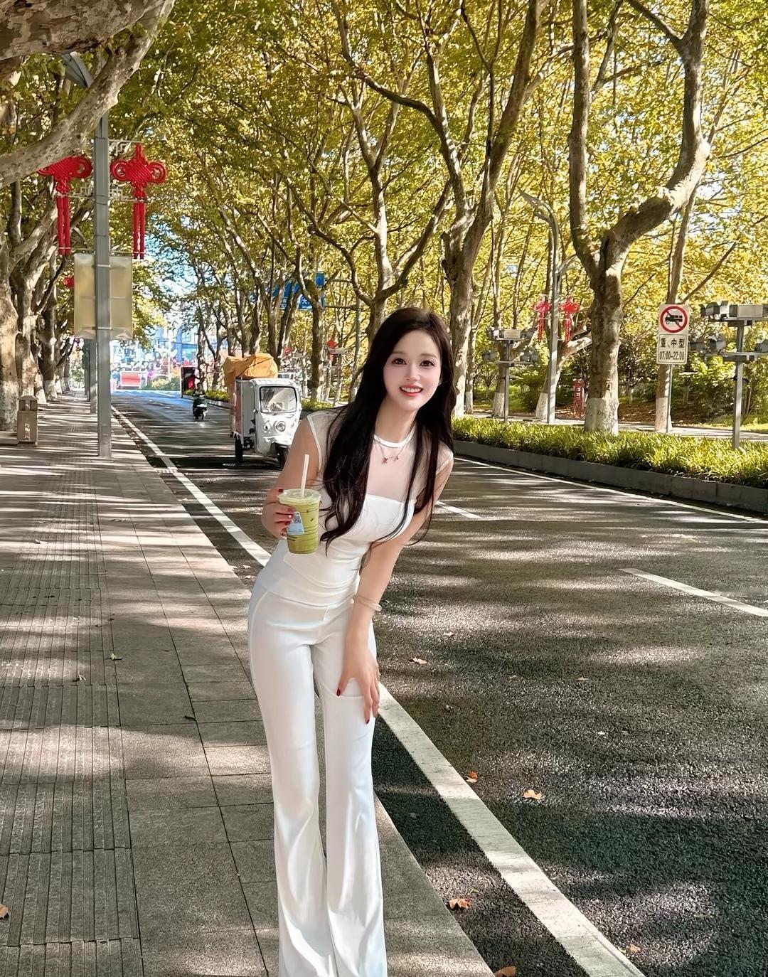 秋日漫步,白色长裤与奶茶的完美搭配🍂☕️