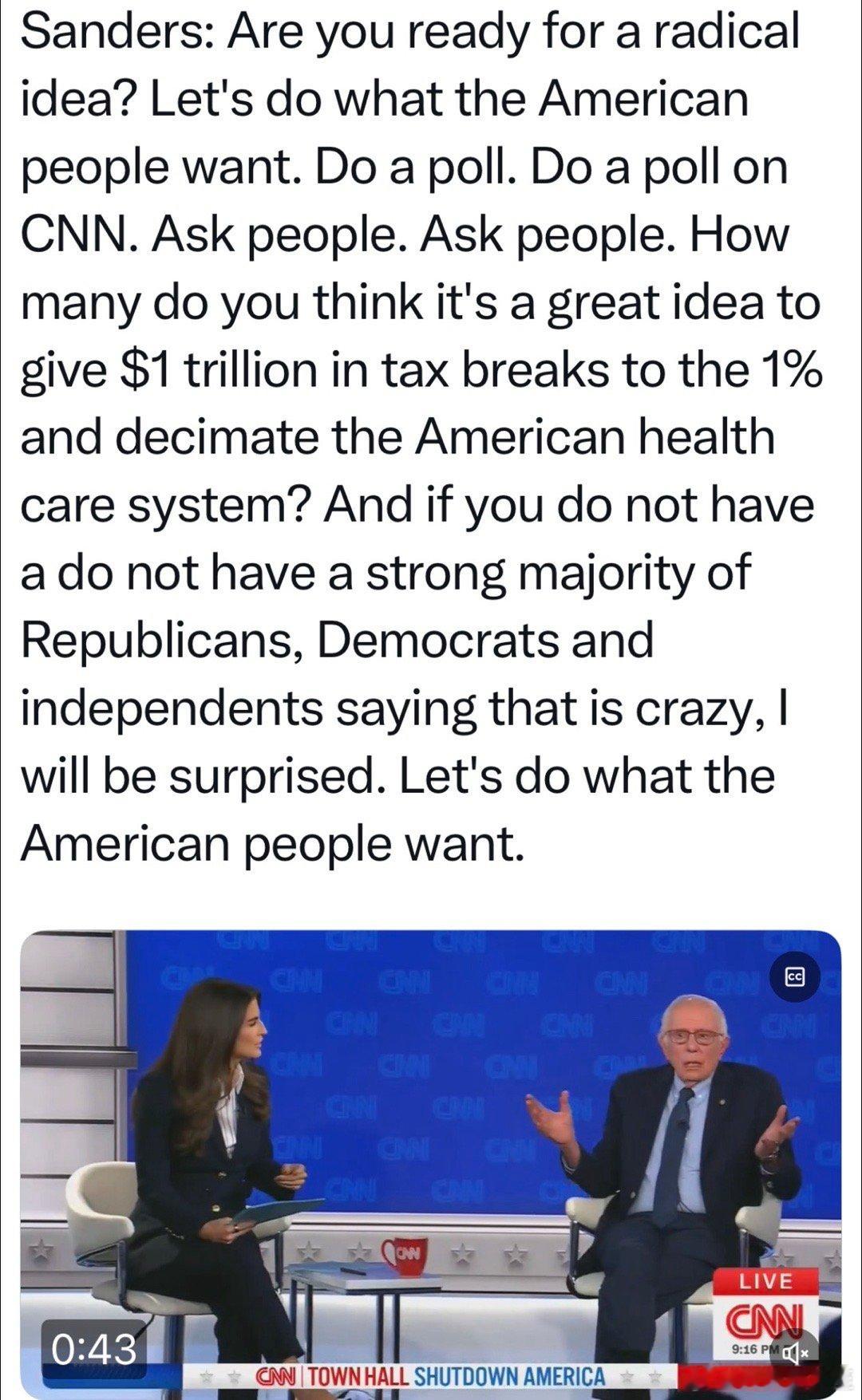 Sanders:让我们更极端一点,听听民众的意见,做全国性民调“给1%减税一万亿、同时摧毁医保”,看看有多少人同意,然后按民意来办