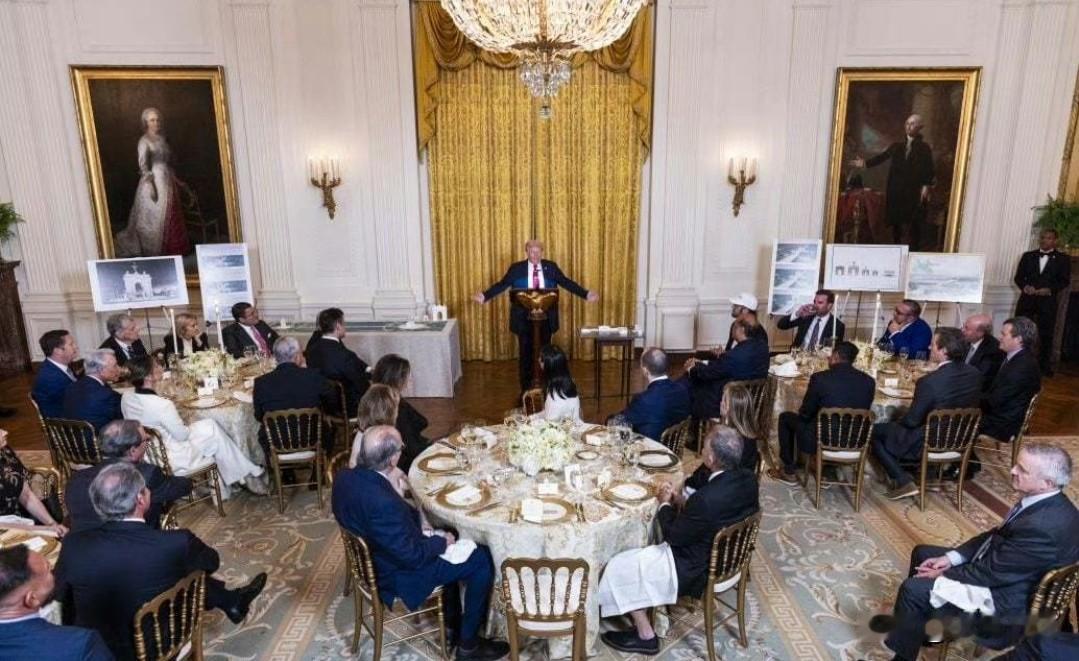 特朗普在白宫设宴感谢金主们慷慨捐款修建白宫宴会厅,并介绍起他的新规划,修建一座凯旋门。