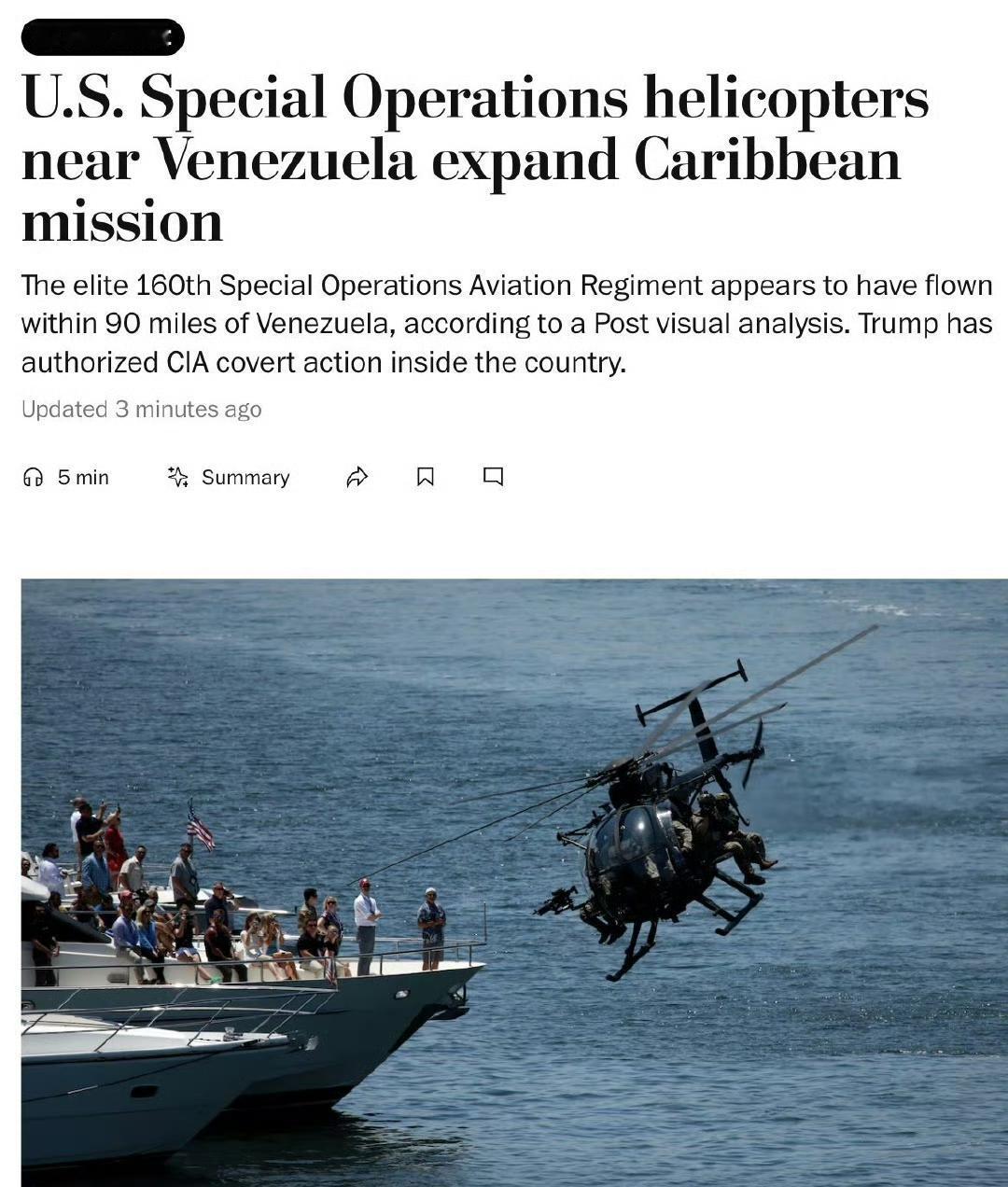 美国特种作战直升机——很可能来自精锐的第160航空团——在加勒比海训练任务中飞抵距委内瑞拉不到90英里的区域。 这些飞行正值特朗普总统授权中情局在委内瑞拉境内开展秘密行动、美军对涉嫌贩毒的船只发动打击之际。 任务似乎涉及停泊在特立尼达附近的移动特战基地“海洋贸易商”号(MV Ocean Trader),标志着美国在该地区大规模集结。 第160特种作战航空团(空降)——绰号“夜行者”——是美军最顶尖的直升机部队,专责为全球特种作战提供空中支援。 他们擅长驾驶改装的支奴干、黑鹰和小鸟直升机,在夜间以低空高速执行任务。 来源:华盛顿邮报