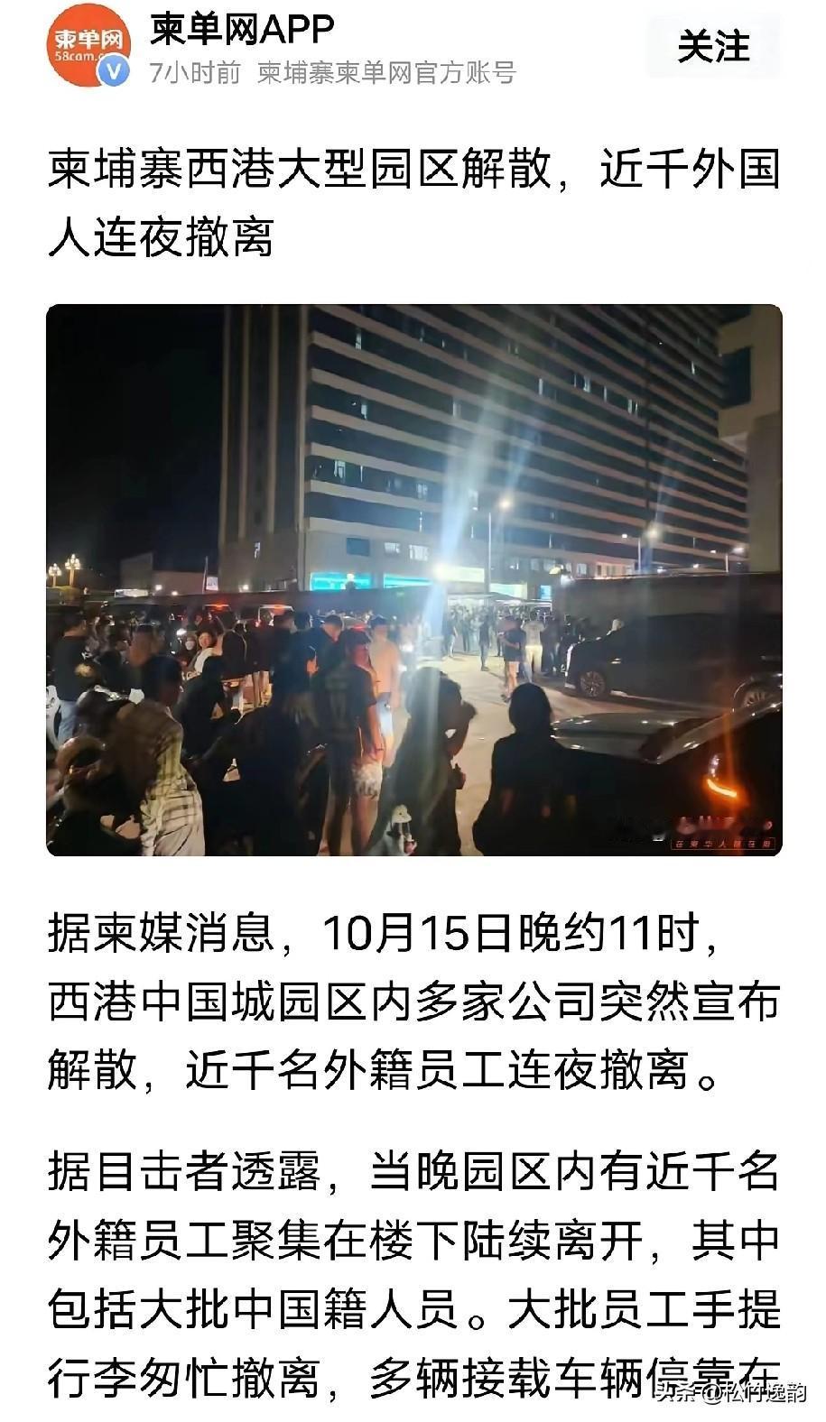 刚刚看到一个新闻,柬埔寨的中国城园区多家公司宣布解散,近千名外籍员工连夜拖着行李上了等待在门口的大巴车,其中包括不少中国籍员工。 发生了什么事情?是转移地点还是彻底散伙呢?但愿是后者。估计是它们听到了什么风声,柬埔寨政府要出手了。 2025年10月15日深夜11点,柬埔寨西哈努克港中国城园区上演了一场现实版“大逃亡”。近千名外籍员工在夜色中匆忙集结,手提行李蜂拥登上等候的大巴车,整个园区笼罩在紧张与不安的氛围中。 现场目击者描述,夜幕下的园区人影惶惶,大批员工提着行李箱匆忙奔走。多辆接应车辆停靠在公司门口,引擎声与催促声交织,秩序一度失控。空地上挤满了不知所措的外籍人员,其中包含大量中国籍员工。 这些公司为何选择在深夜仓促解散?答案或许藏在柬埔寨近期的严厉打击行动中。金边市长坤盛刚刚宣布,该市80%的电诈窝点已被捣毁。内政部长苏速卡更透露,过去两年柬埔寨已驱逐1.5万名涉电诈外籍人员。 西港中国城园区长期被指控与跨国电信诈骗、网络赌博等非法活动关联密切。这里的生态系统一直极不稳定且充满高度风险。 本月4日西港园区刚刚爆发过一场暴动,当时大批外籍员工因劳资纠纷毁坏公司办公室。而就在大规模撤离前两天,西港还发生了两起中国籍人员坠亡事件。 从10月12日起,园区内多家公司就已开始紧急搬迁。物业方面发出通知,要求部分公司在当晚必须搬离。这场撤离更像是有组织的转移,而非彻底散伙。 《彭博》估计西哈努克省这个地区关押或超过6000人。这里已成为跨境犯罪集团的基地和大量诈骗集团的聚居地。 犯罪集团可能预先获得了柬埔寨当局即将采取严厉执法行动的风声,于是闻风而逃。他们也可能是因内部发生重大变故,正将人员和业务转移至其他地区以逃避追踪。 这个世界没有法外之地,无论这些撤离者是准备转移阵地重操旧业,还是真正作鸟兽散,西港园区的这个夜晚都将被记录在案。那片空荡荡的园区,仿佛在无声诉说着一个时代的落幕。 各位读者你们怎么看?欢迎在评论区讨论。 柬埔寨园区诈骗 柬埔寨公司