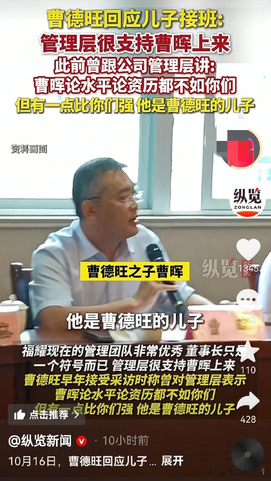 曹德旺福耀玻璃接班人这事儿,再次印证了干得好,不如生的好,就算你是女婿也不行,因为你不姓曹。 所以大家还是要多努力啊,以后才能和后人说话这么硬气和底气,才能让我们的后代按我们的想法接班。 曹德旺曾公开表示,最算自己的儿子曹晖各方面都不如他自己手下的高管,甚至是业务能力、管理能力这些硬伤。但是有一点是谁也比不了的,就这一点比那些高管强就够了,那就是他姓曹,他是曹德旺的儿子。 更何况曹晖在福耀玻璃也不是花瓶,人家也是有海外经验,这些年也是跟着曹德旺走南闯北的学到很多东西,并且曹德旺也不是退休就啥也不管了,还会继续帮衬儿子管理公司,就像小孩子刚学会走路,大人时刻张开双手,为他保驾护航一样,既让他自己放手一搏,又能防止他受伤。 或许他真的是受宗庆后的影响,现在的娃哈哈集团,已经闹的这么凶了,宗庆后努力几十年的心血,可能就要葬送在宗馥莉手里了。 现在自己开了一个大学,也可以专项培养企业需要的各种专业人才,也能给公司持续造血,未尝不是一个以退为进的妙计。 另外虽然自己的女婿叶某在福耀也很突出,能力也很强,甚至比曹晖在某些方面都优秀,但是和自己的亲儿子比起来,多少还是有点差距的,并且还可以避免后期的争权夺利,不能重蹈宗家的覆辙,不能让他30多年的奋斗,一朝便化为乌有! 福耀玻璃能从一个乡镇企业,做到全球第二,成为玻璃大王,也是没谁了,并且还是一个有社会责任感的企业,社会有需要的时候,他们也毫不吝啬,在良心和品质上不能打折扣。 也希望这样的企业越来越多,这样的人越来越多,曹晖能继续走曹德旺的优秀路线,把中国制造走向更多家庭,给更多的人带去福音!