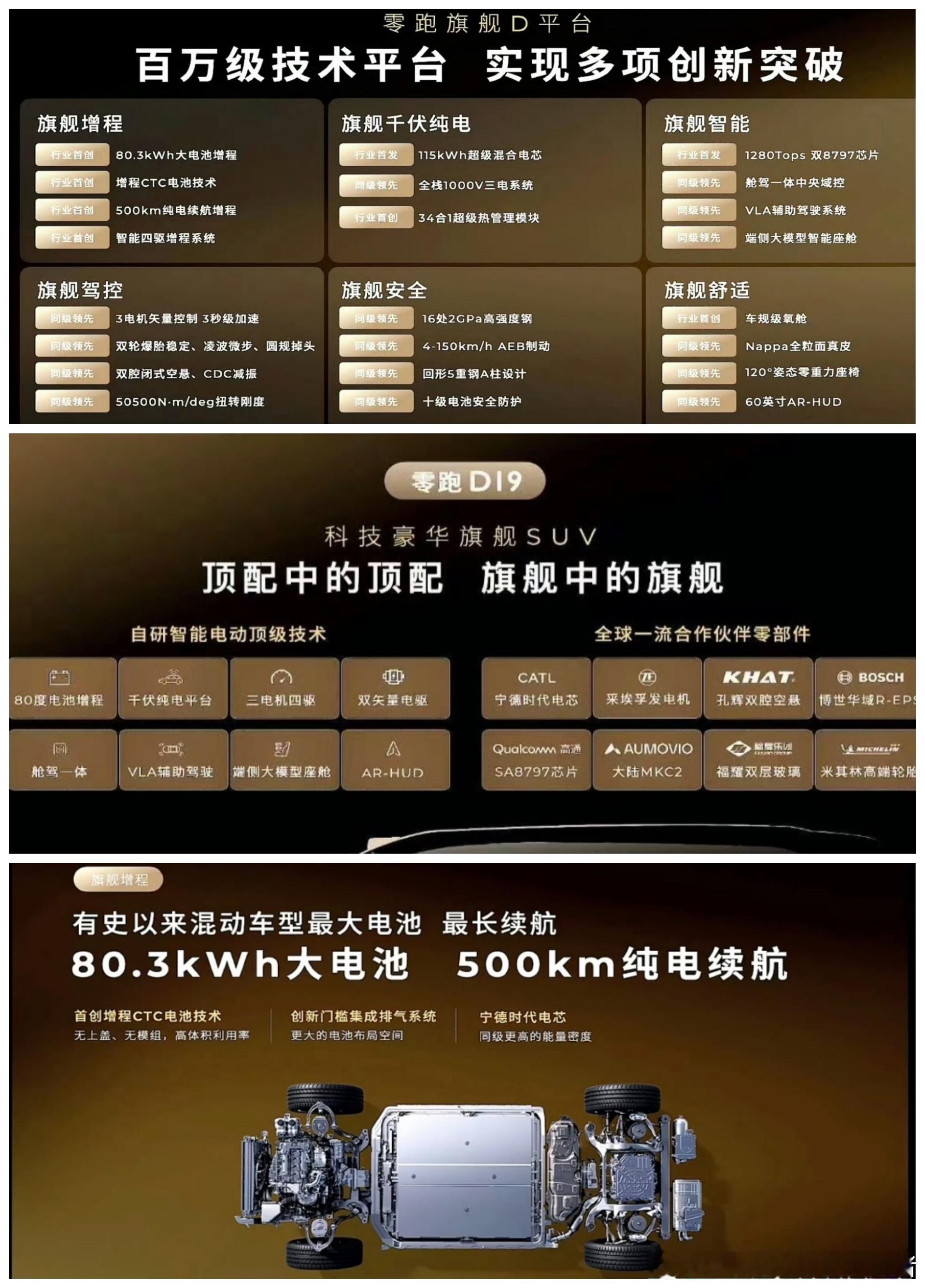 LH手机科技爱好者[超话] 昨天零跑D19亮相,看了一眼它的硬件规格确实很不错。80度的增程大电池,纯电续航直接干到了500公里,增程器成为纯辅助了。