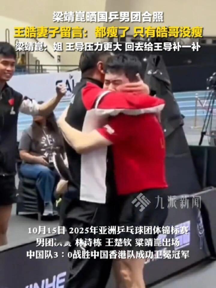 王皓妻子看到亚锦赛夺冠的照片,看着白告的孩子都瘦了,只有王皓没瘦! 师娘看到他们取得成绩,相当骄傲,还是不免有点担心皓哥的压力,善解人意,肯定心疼在外打拼的皓哥! 梁靖崑真的喊姐,太亲切了,这一声姐,白告妻子美到心里去,真的让人很美滋滋,和王皓带的孩子们是一个阶段的!