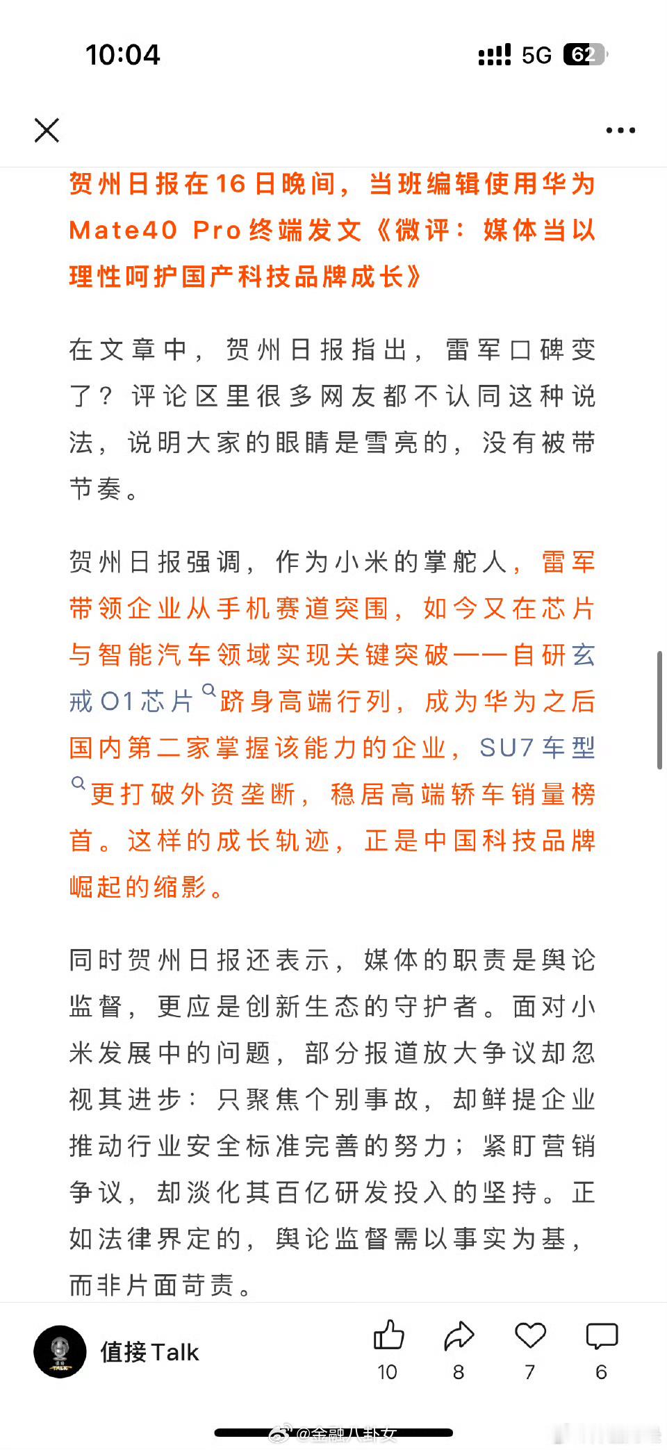 贺州日报力挺雷军,小米是中国科技崛起缩影,部分报道放大争议[思考]