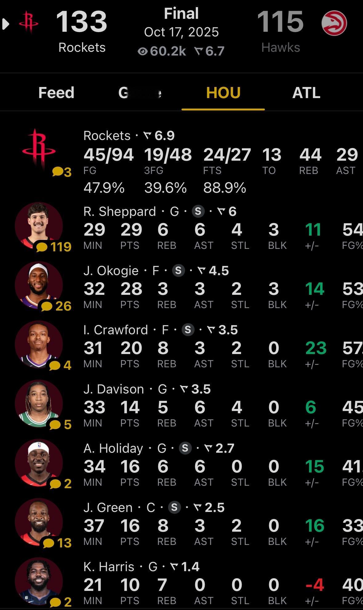完美收官!!!今天火箭在轮休7名主力的情况下在客场以133比115大胜老鹰,以4连胜完美收官季前赛🚀🚀🚀🚀