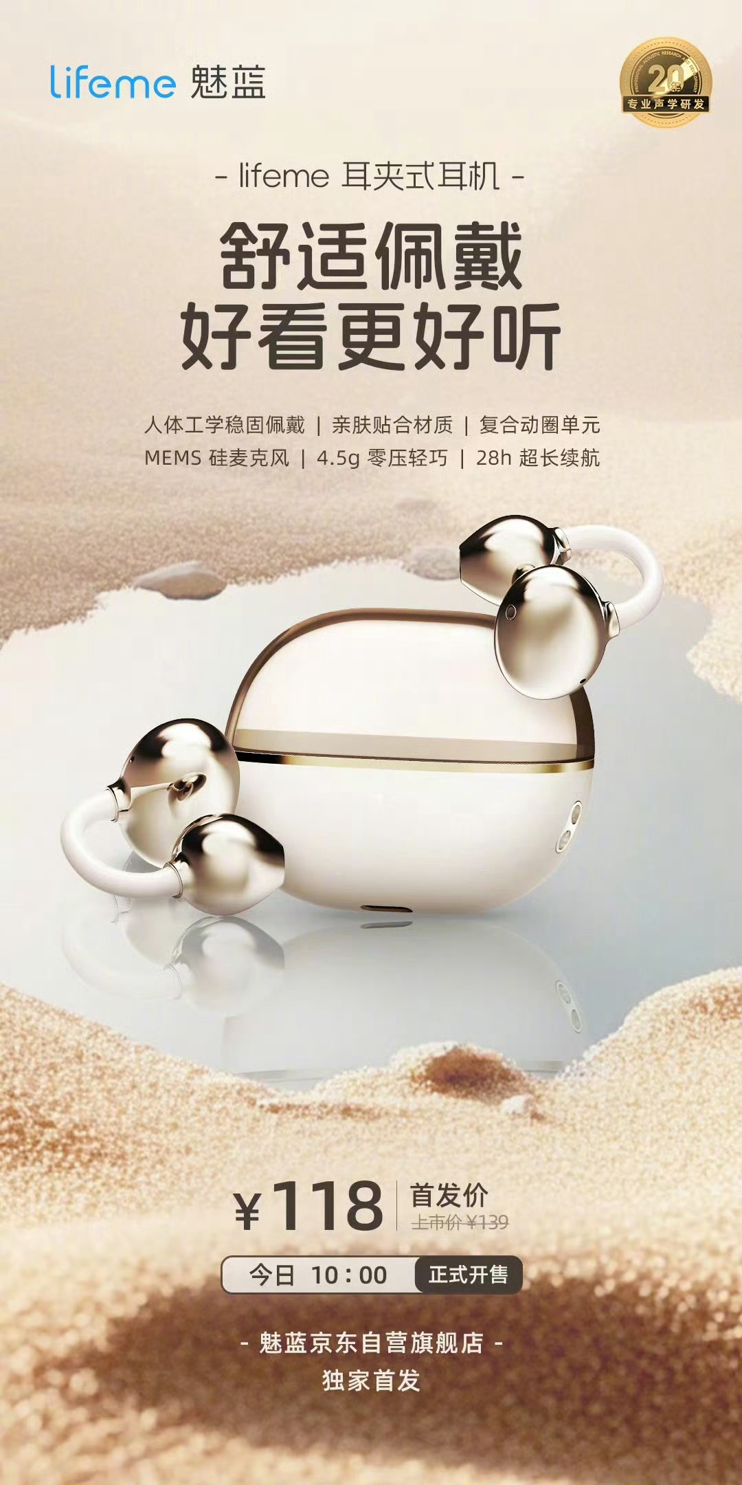 lifeme魅蓝的耳夹式耳机也来了,金属光泽感设计,和之前G2有点类似,金色,你