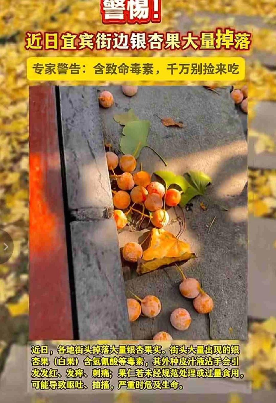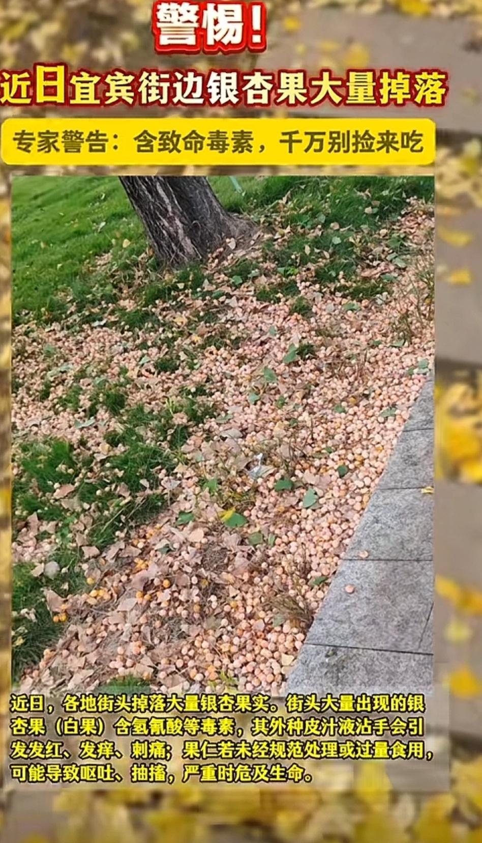 宜宾街头银杏果满地!专家警告含致命毒素,网友:“我妈说去壳就能吃”! 近日宜宾街头银杏果大量掉落,金黄果实铺在路面,本是秋日一景,却因“有毒”话题引发热议——专家明确提醒,银杏果(白果)含有氢氰酸等致命毒素,外种皮汁液沾手会致发红、发痒、刺痛,果仁若未规范处理或过量食用,可能引发呕吐、抽搐,严重时危及生命。 可这份安全警示,却在网友评论区遭遇“反骨”回应:“我妈说可以吃,把壳去了就行,只有专家才吃壳”。 一句调侃,看似是对“专家建议”的轻松反驳,实则藏着对“民间经验”的信任,以及对“毒素风险”的轻视——不少人觉得“老一辈吃了几十年都没事”,便认为专家的警告是“小题大做”,却忽略了银杏果的毒素风险,恰恰藏在“处理方式”和“食用量”里。 老一辈常吃的银杏果,大多经过长时间煮沸、晾晒等处理,高温能破坏部分氢氰酸,且食用量多控制在几颗以内;而街头掉落的银杏果,未经任何处理,外种皮的汁液直接接触皮肤就可能引发过敏,若有人图方便直接去壳生吃,或一次吃十几颗,毒素累积就可能触发中毒反应。 此前就有新闻报道,儿童因误食未处理的银杏果,出现抽搐、意识模糊等严重症状,可见“去壳就能吃”的说法,完全低估了毒素的危害。 更关键的是,“外种皮有毒”的风险也常被忽视。不少人捡银杏果时,会直接用手剥去外层果肉,殊不知汁液中的白果酸、氢化白果酸等成分,会刺激皮肤引发接触性皮炎,严重时还会出现水疱、脱皮,这也是专家强调“别捡”的重要原因——即便不打算吃,光用手接触就可能“中招”。 网友的“反骨”调侃或许无心,但背后的安全隐患不容忽视。秋日街头的野果再诱人,也不能拿健康冒险:遇到掉落的银杏果,别伸手去捡、去剥、去吃;若家中老人坚持“能吃”,不妨科普中毒案例和毒素原理,而非简单对立“专家”与“民间经验”。 毕竟,健康面前,“谨慎”永远比“反骨”更重要,别让秋日美景,变成伤人隐患。 网眼看宜宾 我的今日状态:😪没睡醒 我这里的天气:🍂微风
