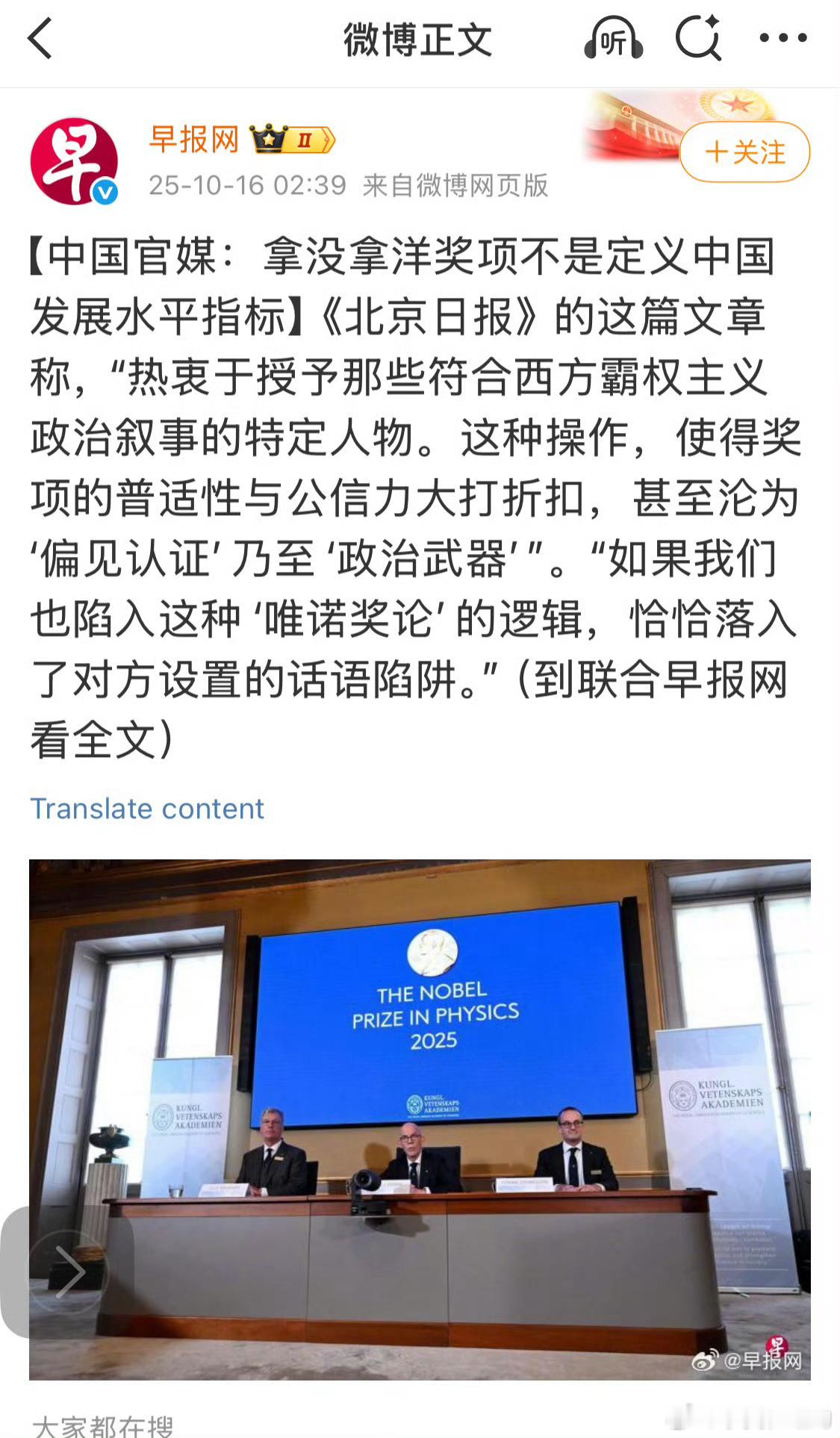 《北京日报》- 「拿没拿洋奖项不是定义中国发展水平指标」